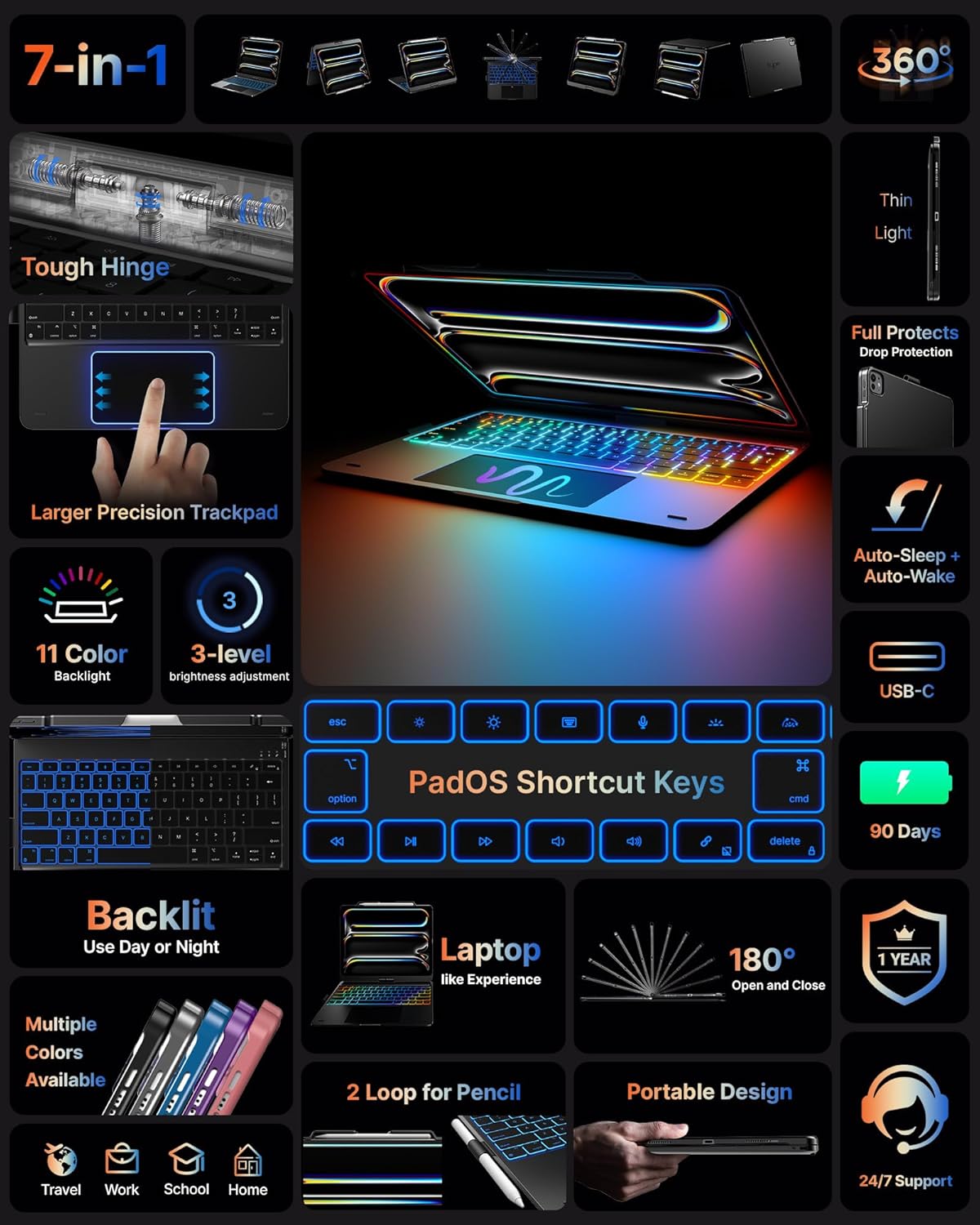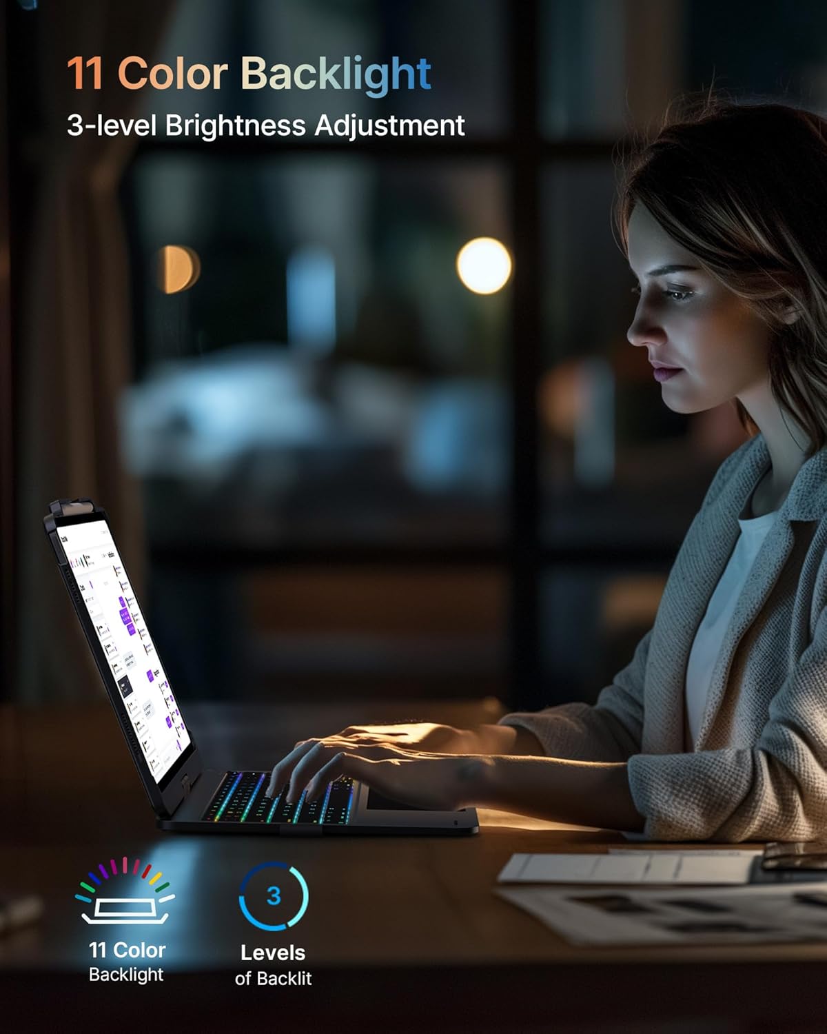 - 11-Color Backlit: 11-color backlit keyboard on this iPad 13 Pro case with keyboard allows brightness adjustment for excellent typing in any light; Includes full set of PadOS multimedia shortcuts for easy volume and music control.