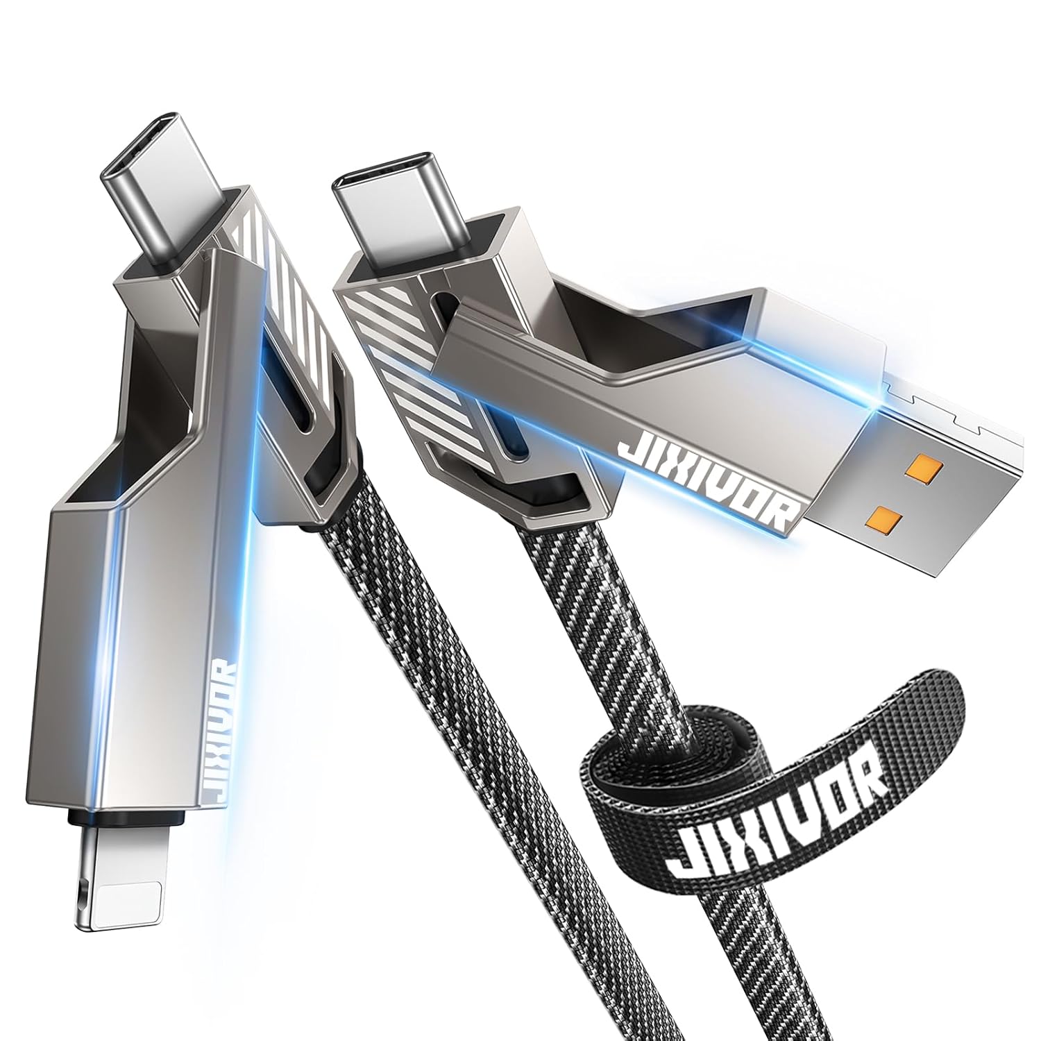 - 60W Fast Charging & 480mbp/s Data Transfer: 4-in-1 USB cable offers high-speed and safe charging up to 60W, enabling faster charging compared to standard cables. It can charge a Samsung S24 Ultra phone to 80% in 30 minutes (actual speed depends on your device and charger). The cable supports data transfer at 40-60MB/s, allowing a 1GB file transfer in 20 seconds. Compatible with iPhone, Samsung, tablets, Air, Mini, Pro, MacBook, and more, this cable saves time and enhances efficiency