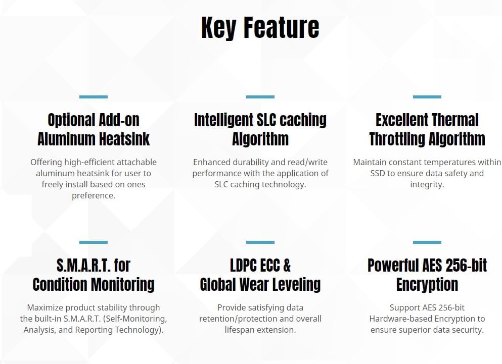 - Special Feature : Excellent Thermal Throttling Algorithm: Maintain constant temperatures within SSD to ensure data safety and integrity., Intelligent SLC caching Algorithm: Enhanced durability and read/write performance with the application of SLC caching technology., Optional Add-on Aluminum Heatsink: Offering high-efficient attachable aluminum heatsink for user to freely install based on ones preference., Powerful AES 256-bit Encryption: Support AES 256-bit Hardware-based Encryption to ensure superior data security., S.M.A.R.T. for Condition Monitoring: Maximize product stability through the built-in S.M.A.R.T. (Self-Monitoring, Analysis, and Reporting Technology). Excellent Thermal Throttling Algorithm: Maintain constant temperatures within SSD to ensure data safety and integrity., Intelligent SLC caching Algorithm: Enhanced durability and read/write performance with the application of SLC⊠See more