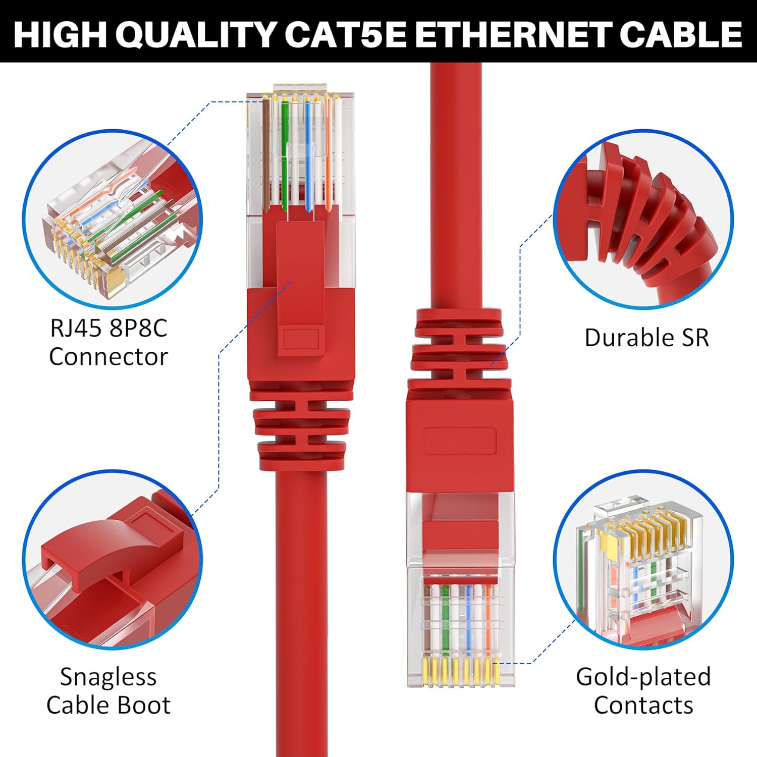 Cat5e Ethernet Cable 75 FT, Cat 5e Internet Cable, Red Snagless Patch Cord, Flexible, Network, LAN, PoE, Standard RJ45 Connector for PC, Server, Router, Modem, TV, PS5 - with 15 Cable Ties