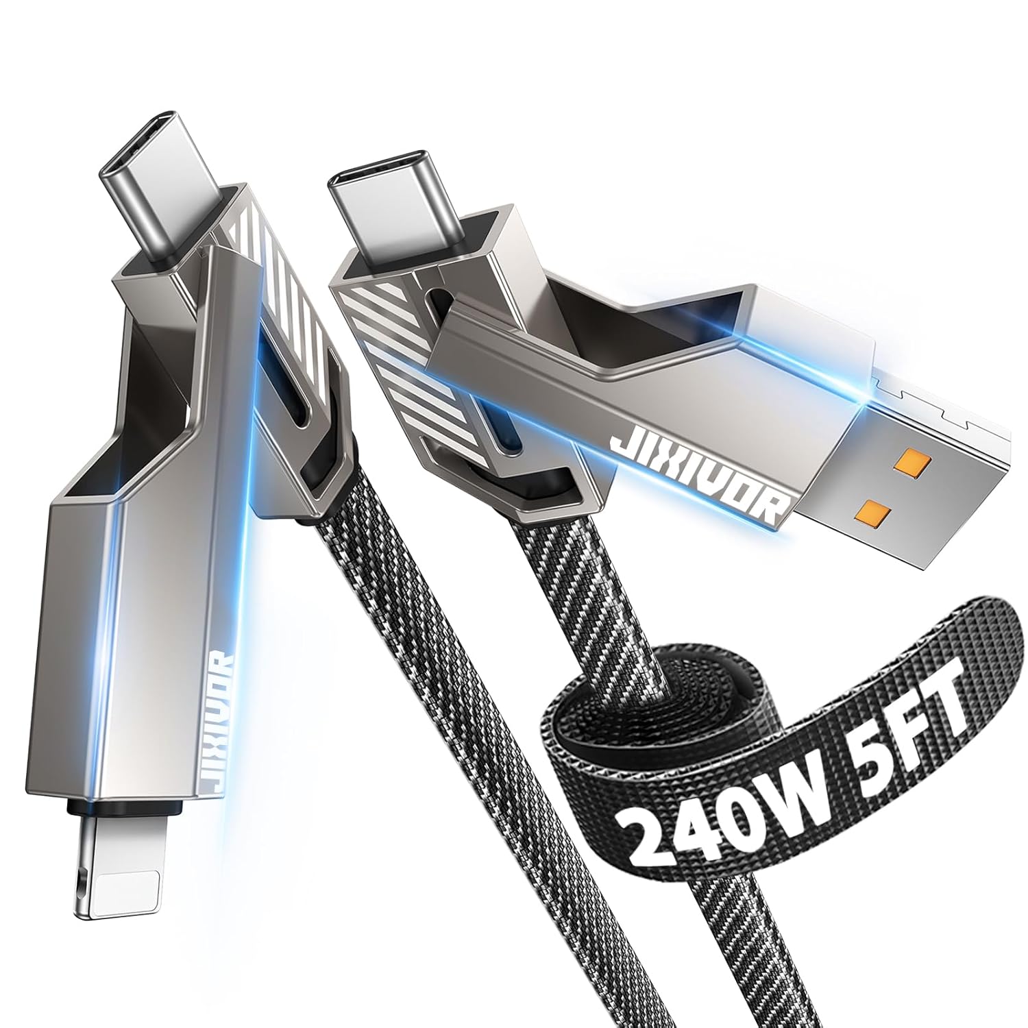 - Easy to store and carry: The 5FT length is perfect for use at home, in the office, in the car, or while traveling. The 4-in-1 USB charging cable is easy to fold and store in your handbag, laptop bag, pocket, and more. Reduce clutter and save space