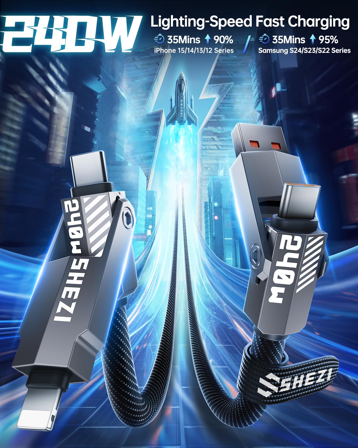 - Versatile 4-in-1 Design: SHEZI upgraded 4-in-1 multi charging cable adopts a rocket shape design of multiple ports, which meets your variety of charging needs in one cable.Charge and sync your devices without the hassle of switching between multiple cables. Simplify your charging setup with our versatile 4-in-1 usb-c cable.