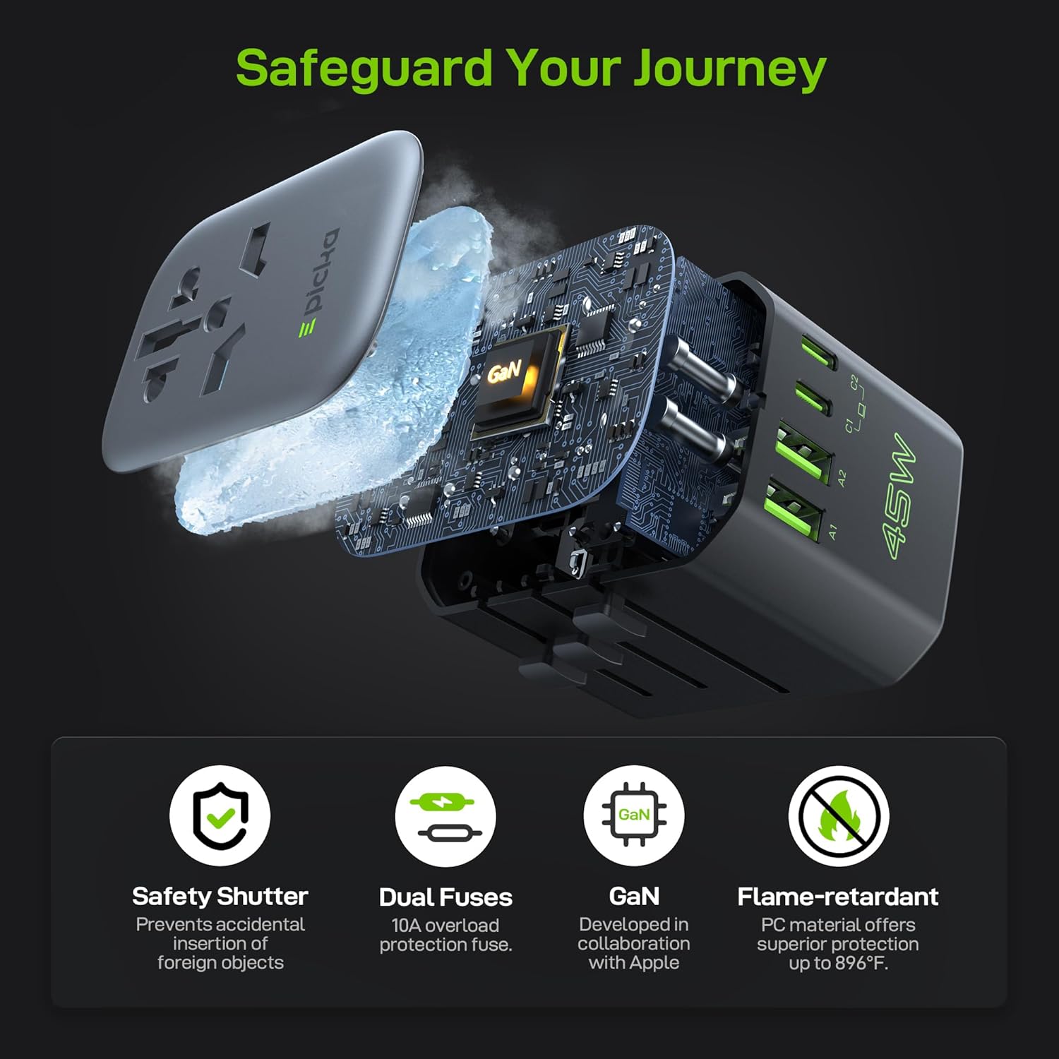 - SAFETY ENSURED - This travel adapter is equipped with a built-in 10A fuse and safety shutters designed to prevent overloads and accidental insertion by children. Made from durable, fire-resistant materials, it meets the highest safety standards and holds RoHS, CE, and FCC certifications for reliable performance. To ensure your peace of mind, it also comes with a 2-year warranty, so you can travel confidently knowing your devices are protected.