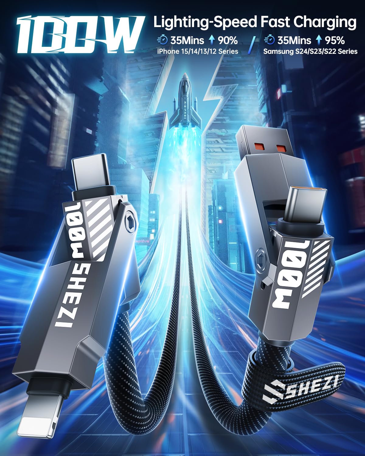 - Versatile 4-in-1 Design: SHEZI upgraded 4-in-1 multi charging cable adopts a rocket shape design of multiple ports, which meets your variety of charging needs in one cable.Charge and sync your devices without the hassle of switching between multiple cables. Simplify your charging setup with our versatile 4-in-1 usb-c cable.