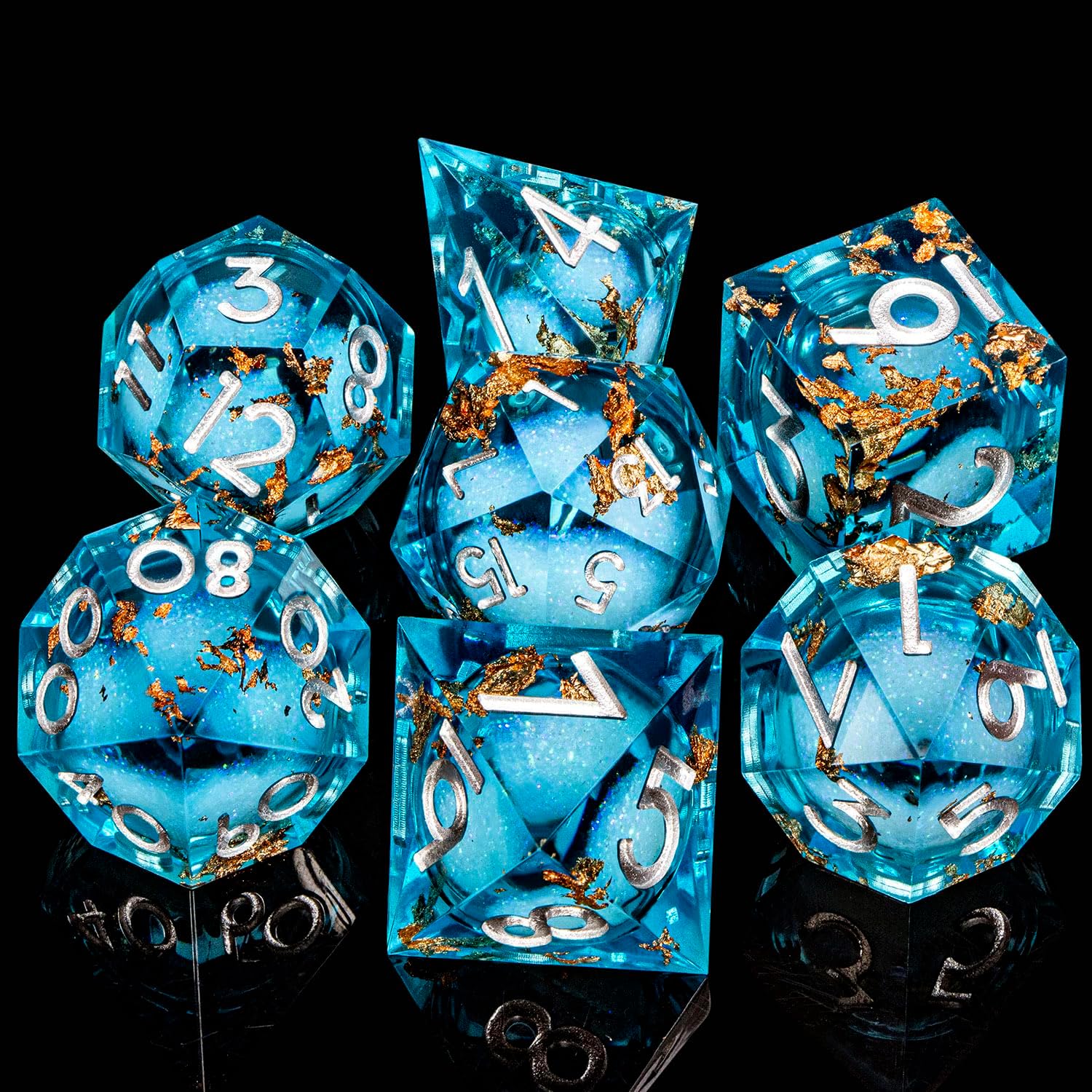 DND Dice Blue Liquid Core Dice Set with Metal Box, Handmade Sharp Edge D and D Polyhedral Dice for use with RPG D&D Role Playing Game