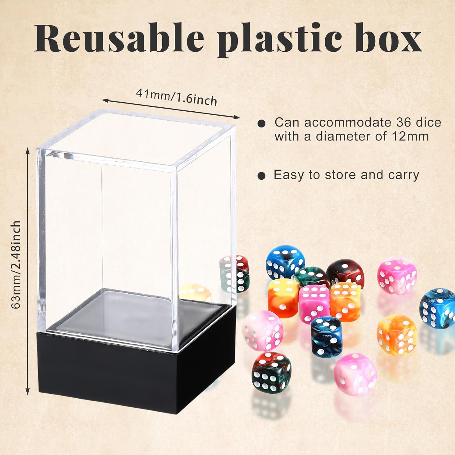 - Convenient Portability: our dice set comes with a transparent storage box, allowing you to keep your dice organized and secure; No more worries about losing or misplacing your dice; The compact size of the box makes it easy to carry in your pockets, handbags, backpacks, or game bags, ensuring that you can enjoy your favorite games anytime, anywhere