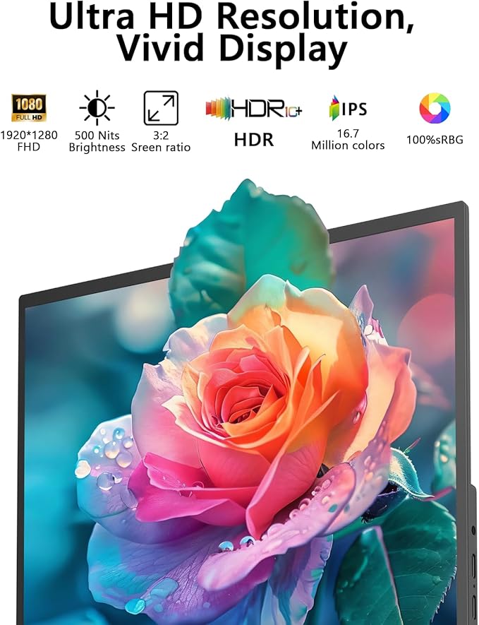 - [ FHD 1280P Portable Laptop Monitor ]: Upgrade your setup with a compact 10.5-inch FHD portable monitor. Featuring a 1920*1280P IPS screen with HDR mode and 178° wide viewing angles, it delivers stunning clarity and smooth visuals whether you’re working, streaming, or gaming.