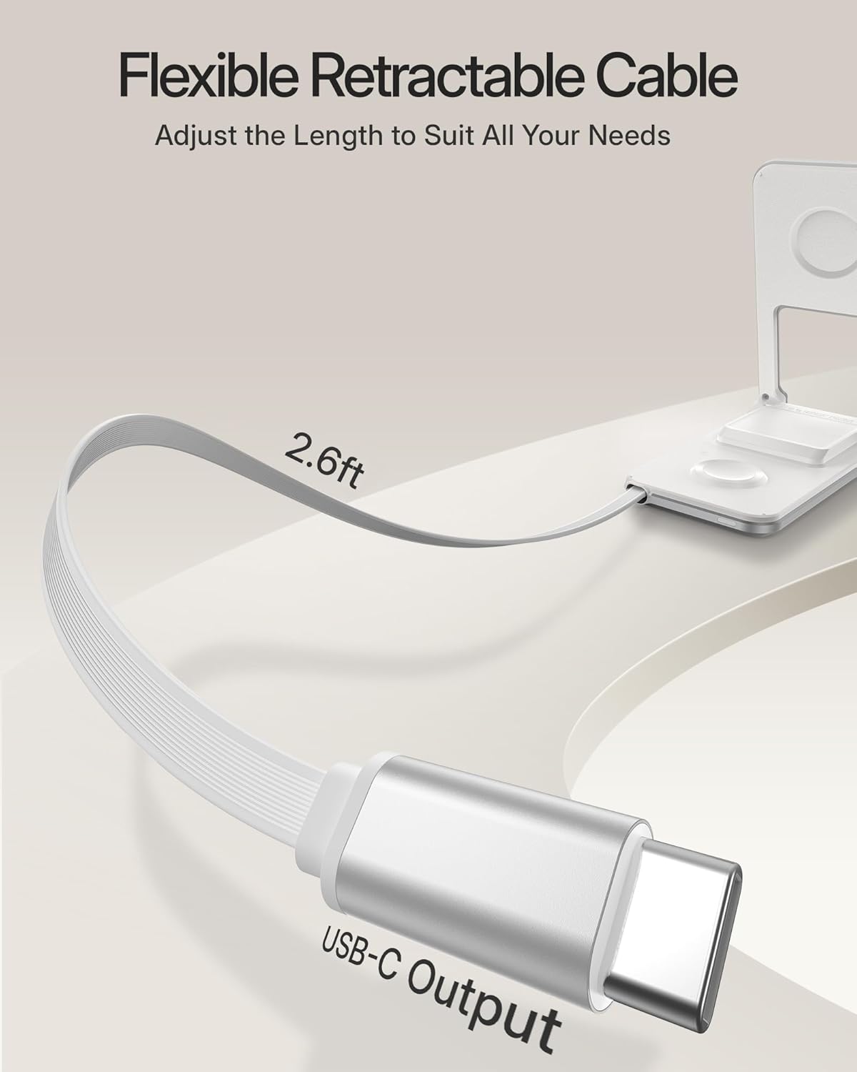 - Flexible Retractable Cable: The charger stand comes with a built-in 2.6ft retractable USB-C cable. Simply push the button at the back to extend the cable, and gently pull to retract it. Say goodbye to tangled cords and messy cables, keeping your space neat