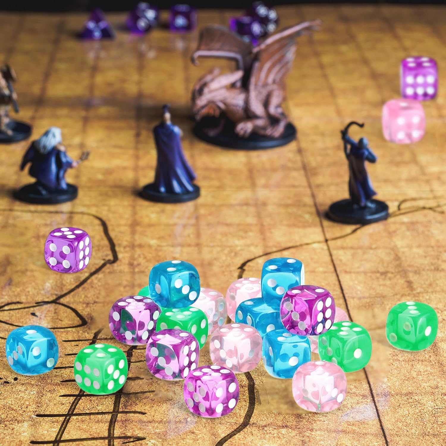 - Compact Size and Colors: our 12mm (0.47 inches) dice are smaller than the standard size, making them ideal for easy rolling and handling; Each set features 36 dice in 4 captivating translucent colors: pink, purple, blue and green; These colors not only add charm and personality to your gaming experience but also make it effortless to distinguish and categorize your dice