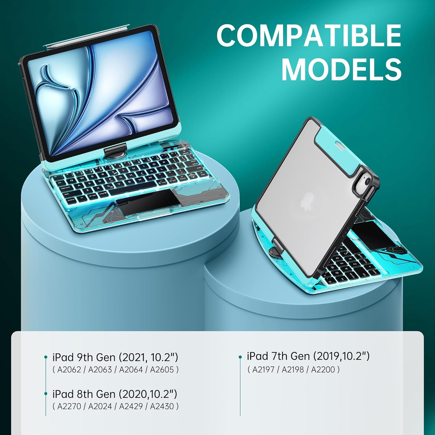 GUSGU Transparent Case with Wireless Keyboard for iPad 10.2-in (7th, 8th, and 9th Gen), 7 Colors Backlight, Trackpad, 360°Rotating Stand, Tech Style