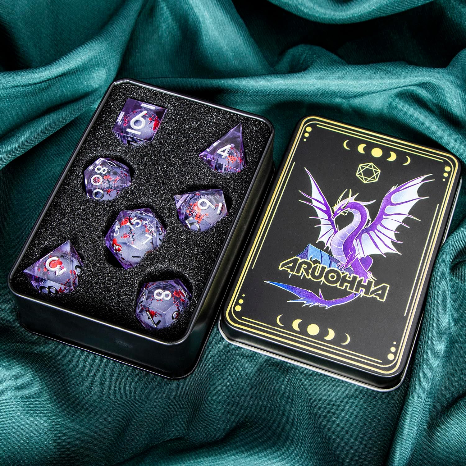 ARUOHHA DND Resin Dice Plum Blossom Liquid Core Silver Purple Sharp Edged Polyhedral Dragons Dice Set with Gift Box, Dungeons D and D Dice Compatible with D&D Role Playing Game D20 D12 D8 D6 D4