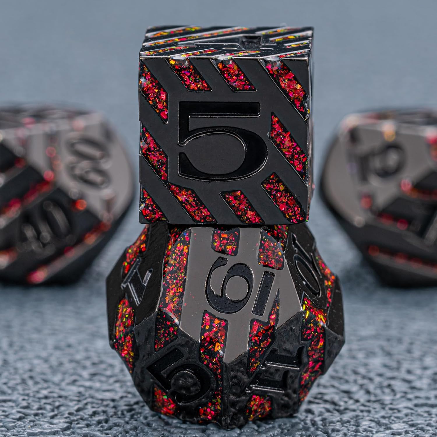 Metal Dice Set DND,Metallic Glitter Stripes D&D Dice Set,7 PCS Polyhedral Dice Set with Gift Case for Dungeons and Dragons Tabletop Game(Black Nickel Red)