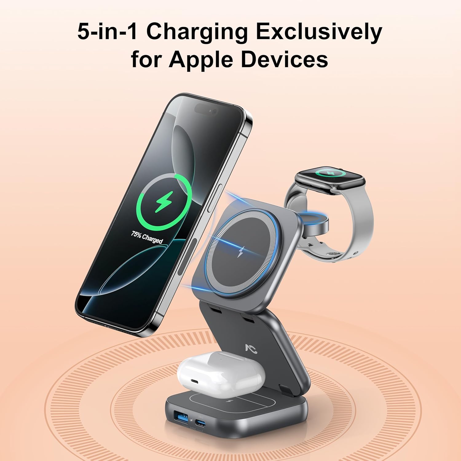 5-in-1 Wireless Charger for MagSafe, AC ISLAND Portable Travel Charging Station, 15W Max Fast Foldable Magnetic Stand, Evolved for iPhone 16/15/14/13 Series, Apple Watch, AirPods (with 35W Adapter)