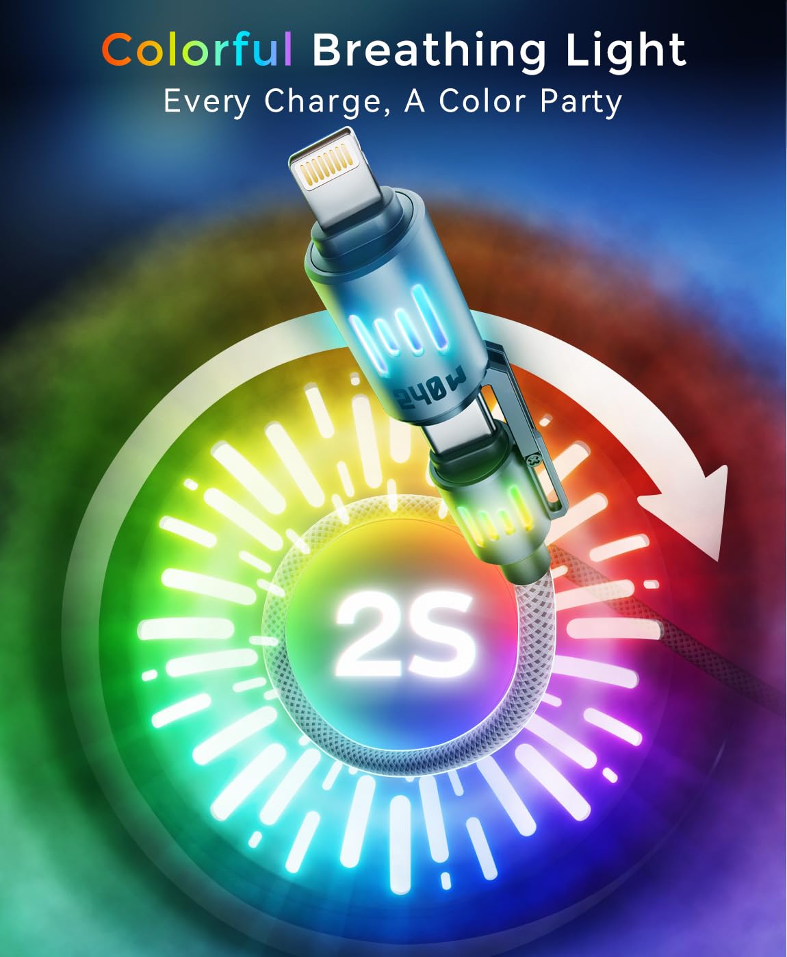 - Dynamic RGB Breathing light: When this USB C Cable is charging, the RGB Breathing lights on the two connectors change color continuously. A soft colorful light, full of fashion atmosphere and not flashing eyes, easy to find in a dark environment and full of gaming atmosphere.