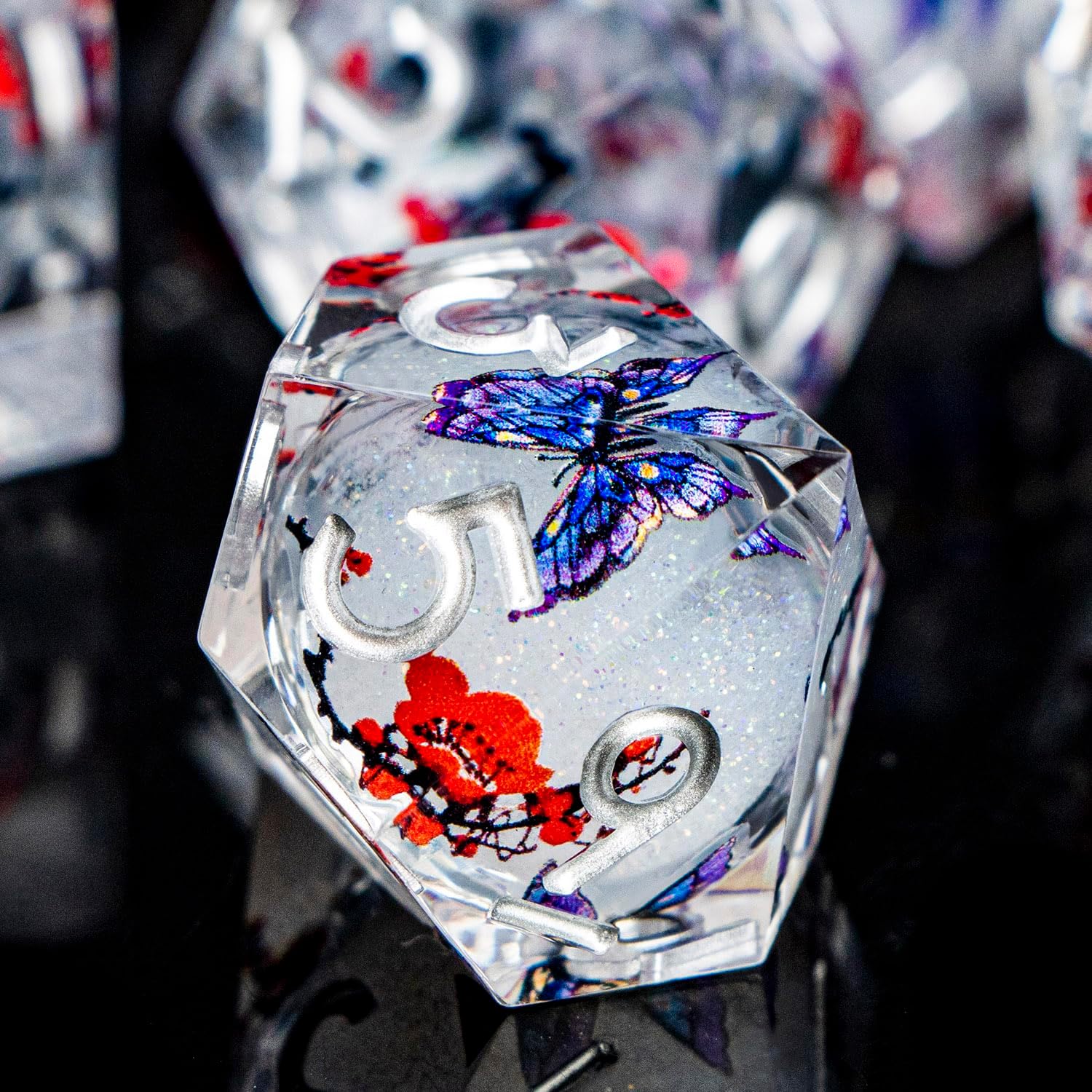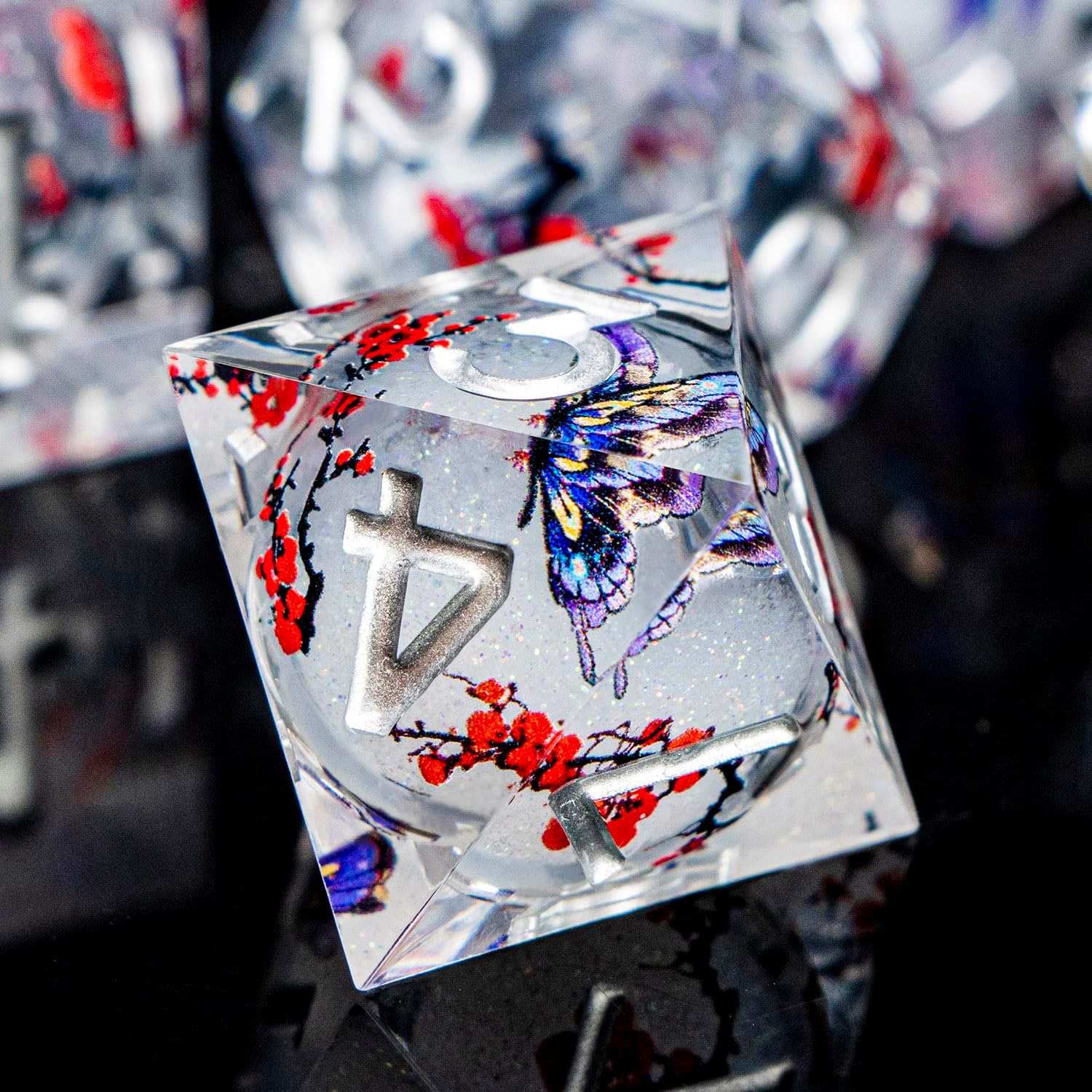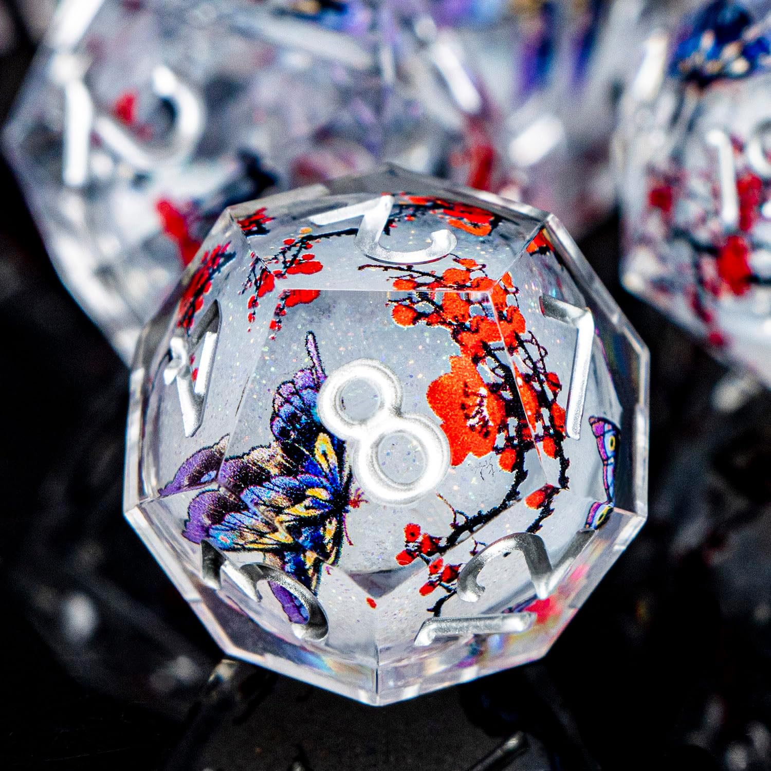 Butterfly DND Dice White Liquid Core Dice Set with Metal Box, Handmade Sharp Edge D and D Polyhedral Dice for use with D&D RPG Role Playing Game