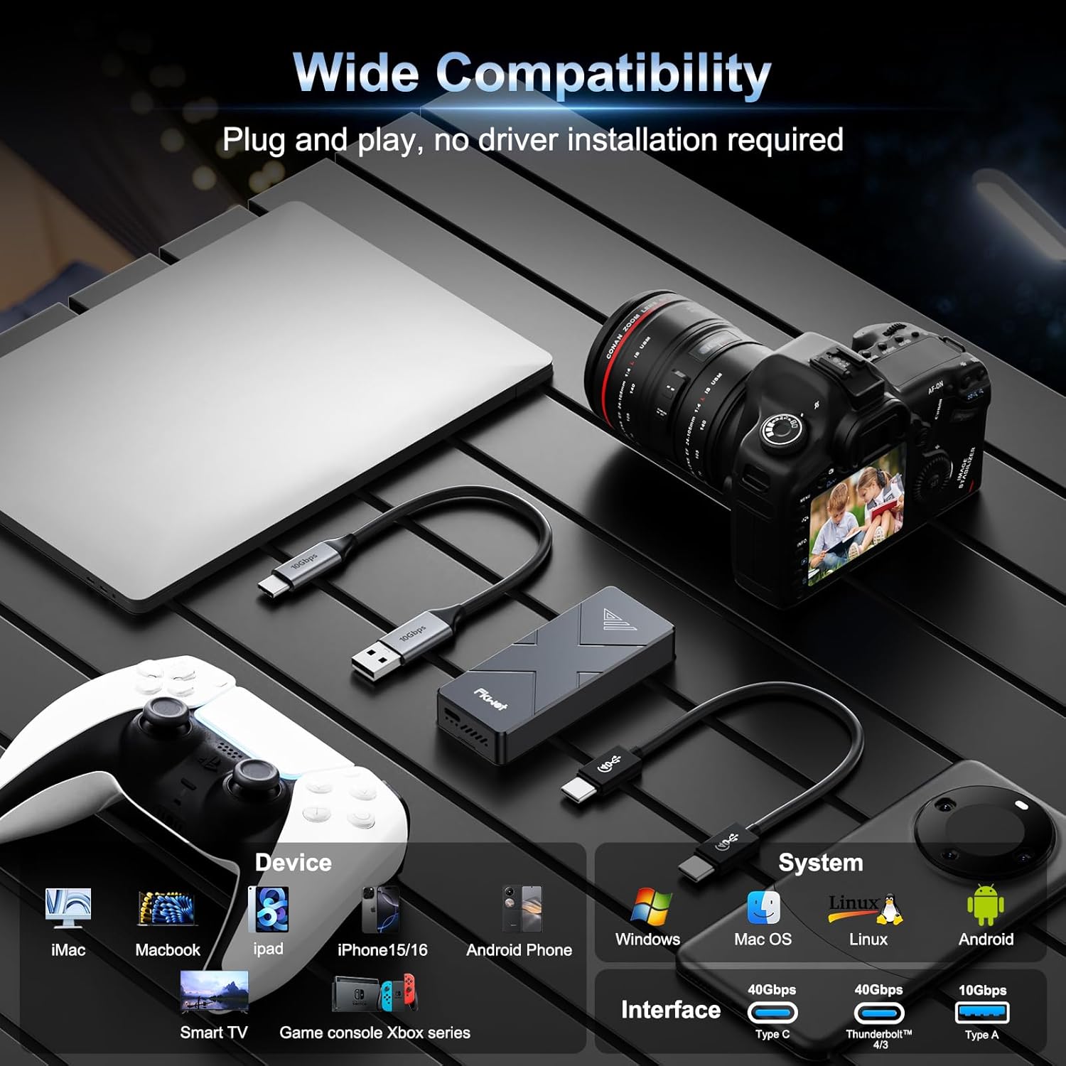 - 【Widely Compatible】FP110 Solid State External Hard Drive requires no software installation; simply plug and play. It supports both Thunderbolt 3/4 (40Gbps) and USB-C (10Gbps) dual modes, making it compatible with devices such as iMacs, MacBooks, iPads, iPhone15/16 series models, Android phones, Smart TVs, Xbox game consoles, as well as various operating systems including Windows, macOS, Linux, and Android.