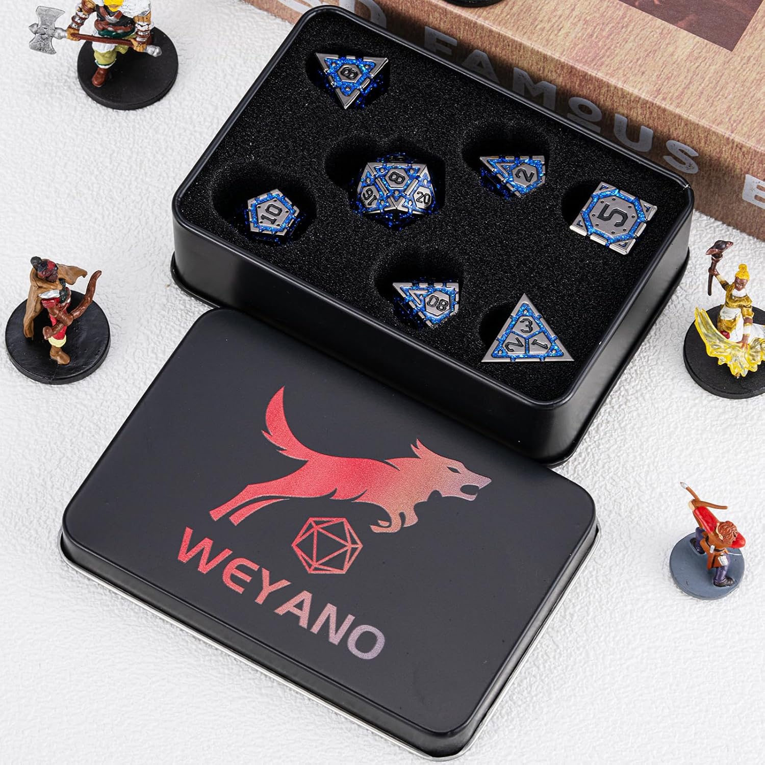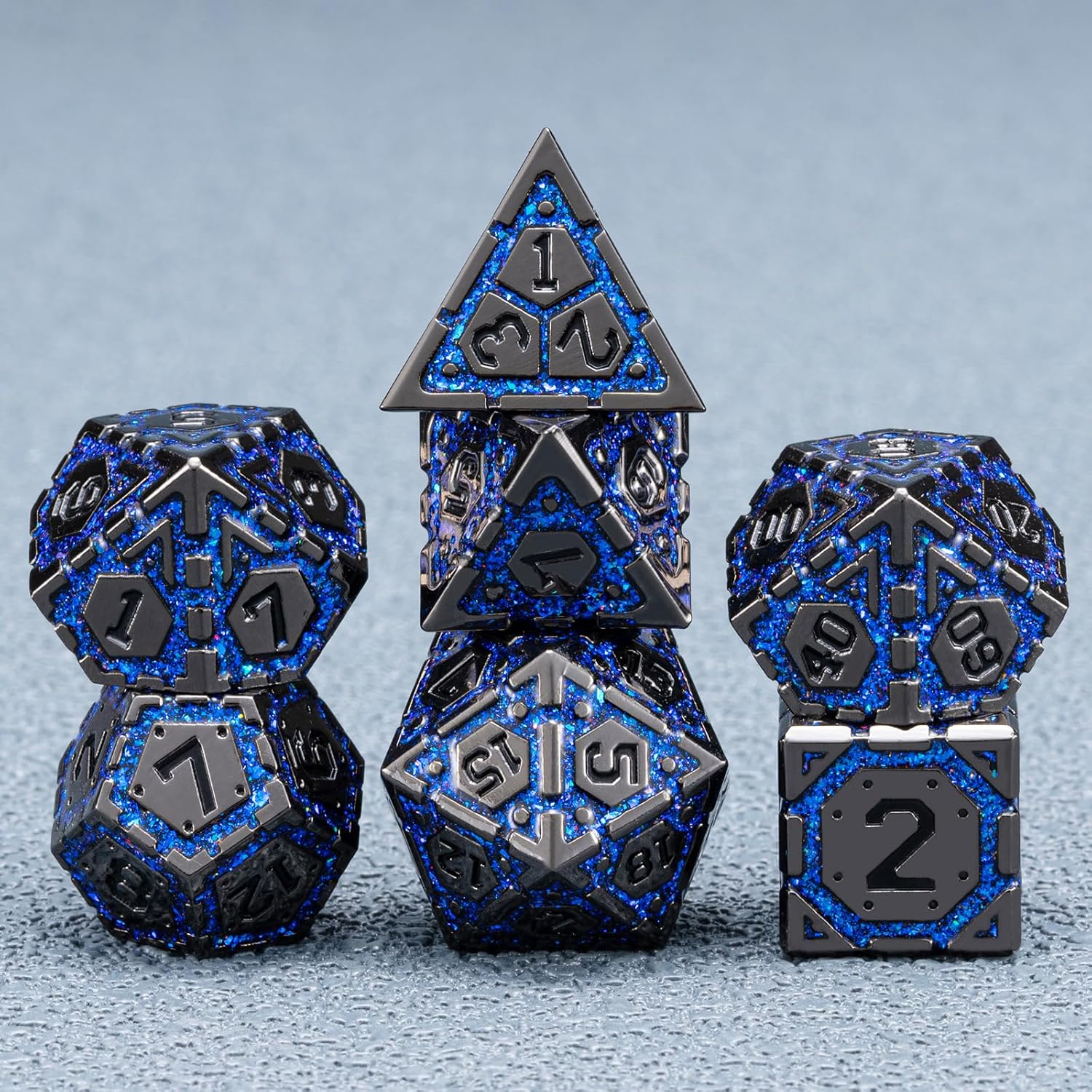 DND Metal Dice Set with Cracks, Polyhedral Dice for RPG D&D Dungeons and Dragons RPG TTRPG D and D 7-Die with Gift Case (Black Nickel Sapphire Blue)