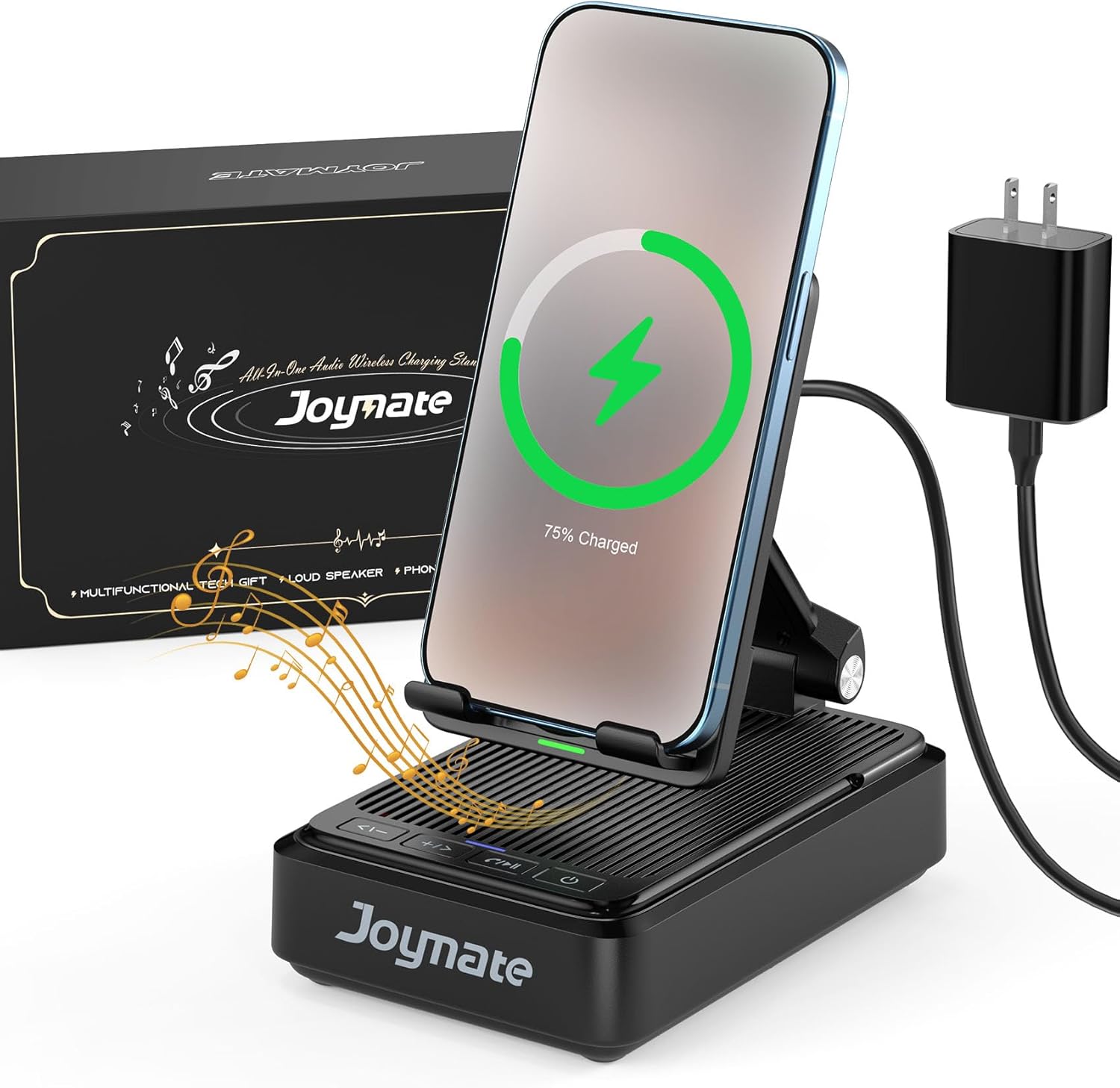 Gifts for Men and Women, Wireless Phone Charger Stand with Bluetooth Speaker and Adjustable Angle Phone Holder for Desk Tech Gift for Birthday/Anniversary (Black)