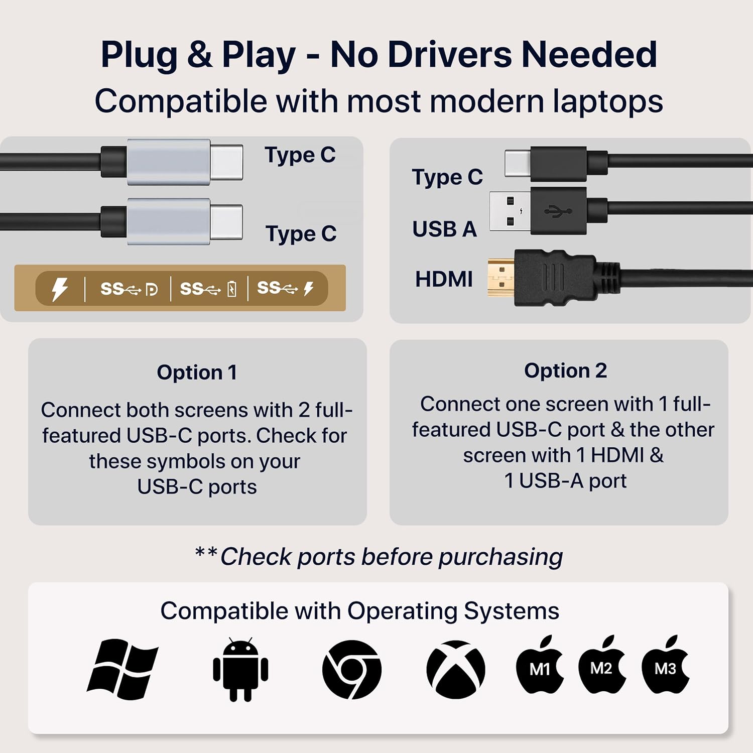 - MACBOOK CONNECTION - With certain Macbook models it's not possible to directly connect the screens but there are USB hubs available that will allow you to connect anyways. Make sure to check our images on the ports to see what is available for your model!