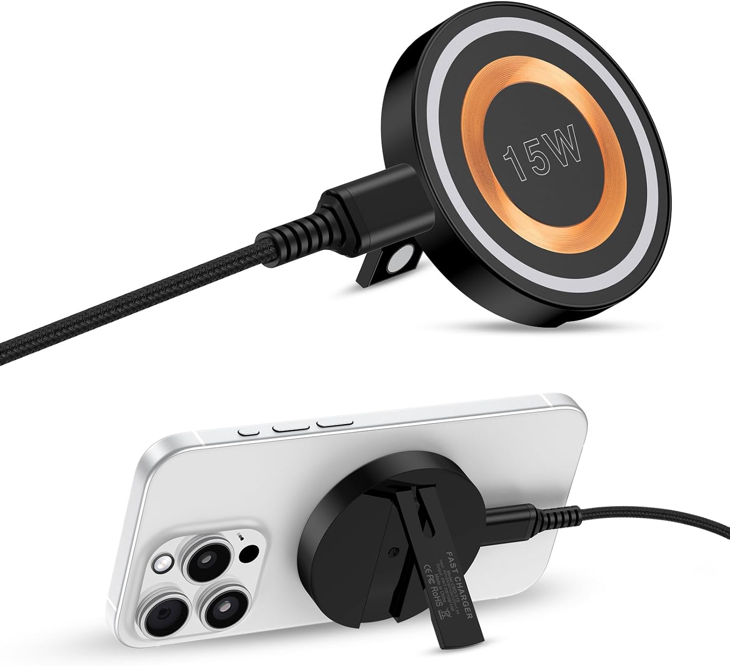 - 15W Fast Magnetic Charging & Built-in Kickstand: 15W Fast Charging let your device charge faster.The magnetic charging feature makes the magsafe charger perfectly aligned with your phone and firmly attached.Magnetic wireless charger also work as a MagSafe kickstand. The built-in kickstand adjust your phone to a comfortable video-watching angle, perfect for enjoying movies and FaceTime.
