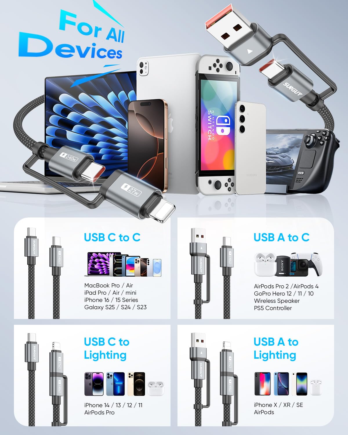 SUNGUY 4-in-1 Charging Cable 3FT, MAX 240W Multi Charge Cable with Lighting/Type C/USB A Port, USB A/Lighting to USB C Cable Adapter for iPhone 16/15/14 Pro Max, Galaxy S24 S23 S22 and More