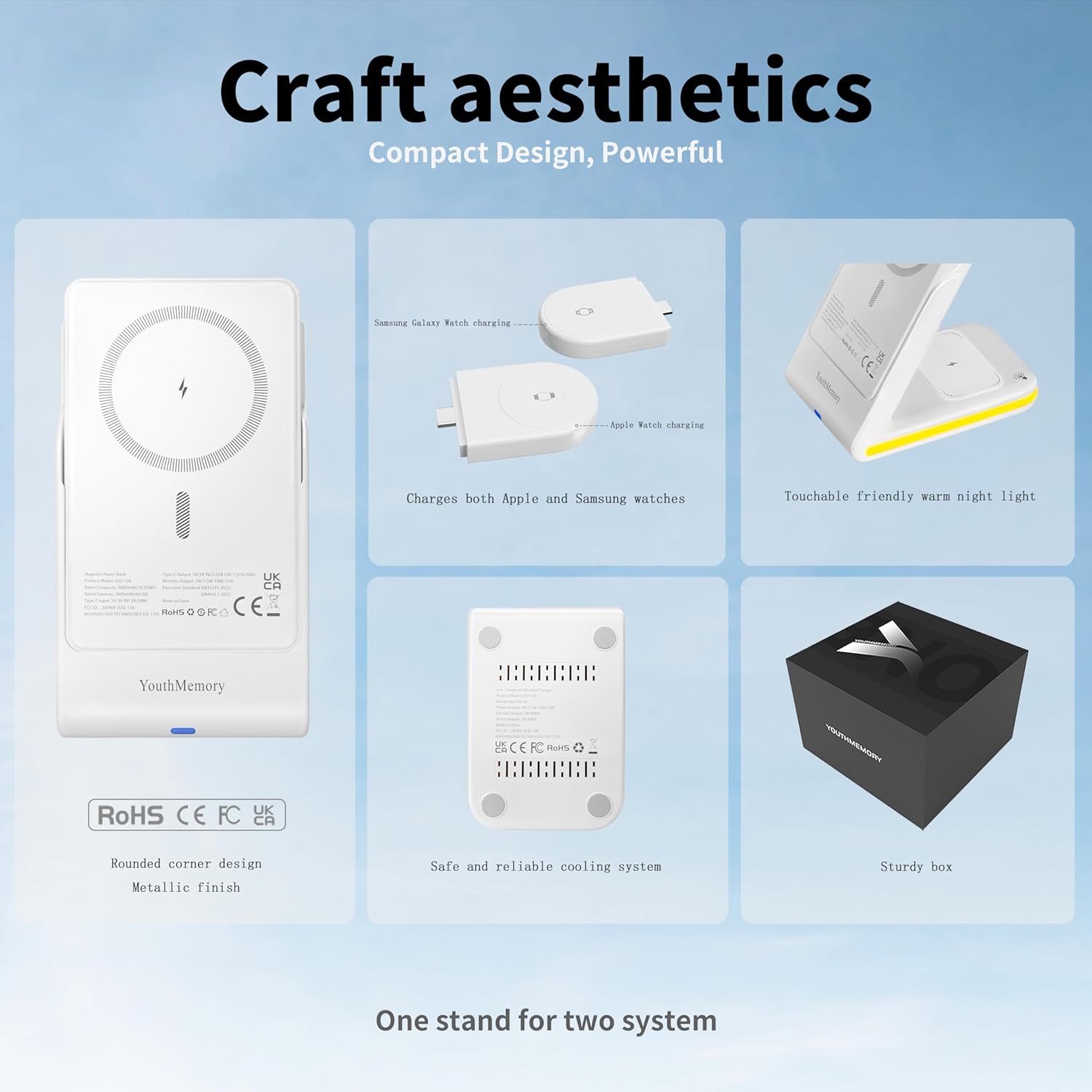 - 【YouthMemory 5-in-1 Charger Stand Customer Friendly Features】It is equipped with a non-slip surface and case-friendly. hen you use YouthMenory Charging Station, Samsung Phones need magnet cases. Our Charging stand helps to keep devices organized and charged while enhancing any room or office with its sleek appearance.