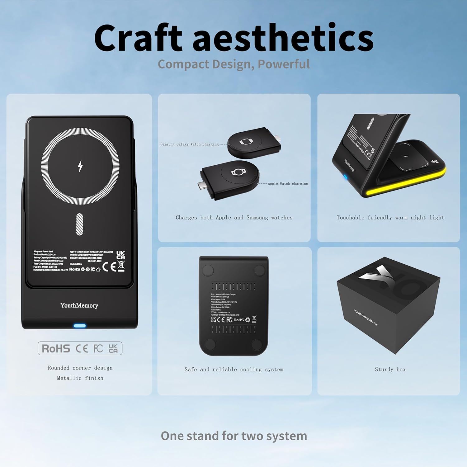 - 【Detachable & Portable Charger Power Bank Charger Stand Design】Our wireless charger station comes with a detachable 5000mAh slim power bank. Featuring a foldable, lightweight design, this charging station is ideal for home, office, travel or trip. Manufacturer designed it to fit easily into bags, it makes a thoughtful present for loved ones who need reliable charging on the go.