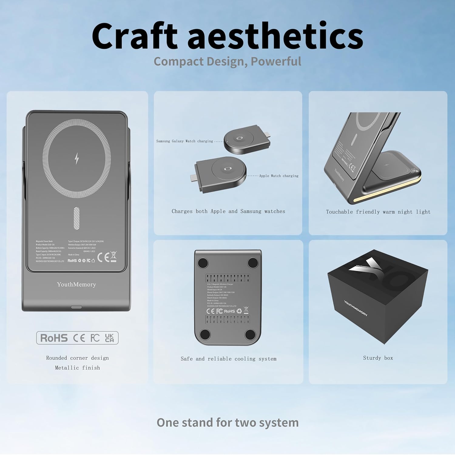 - 【YouthMemory 5-in-1 Charger Stand Customer Friendly Features】It is equipped with a non-slip surface and case-friendly. hen you use YouthMenory Charging Station, Samsung Phones need magnet cases. Our Charging stand helps to keep devices organized and charged while enhancing any room or office with its sleek appearance.
