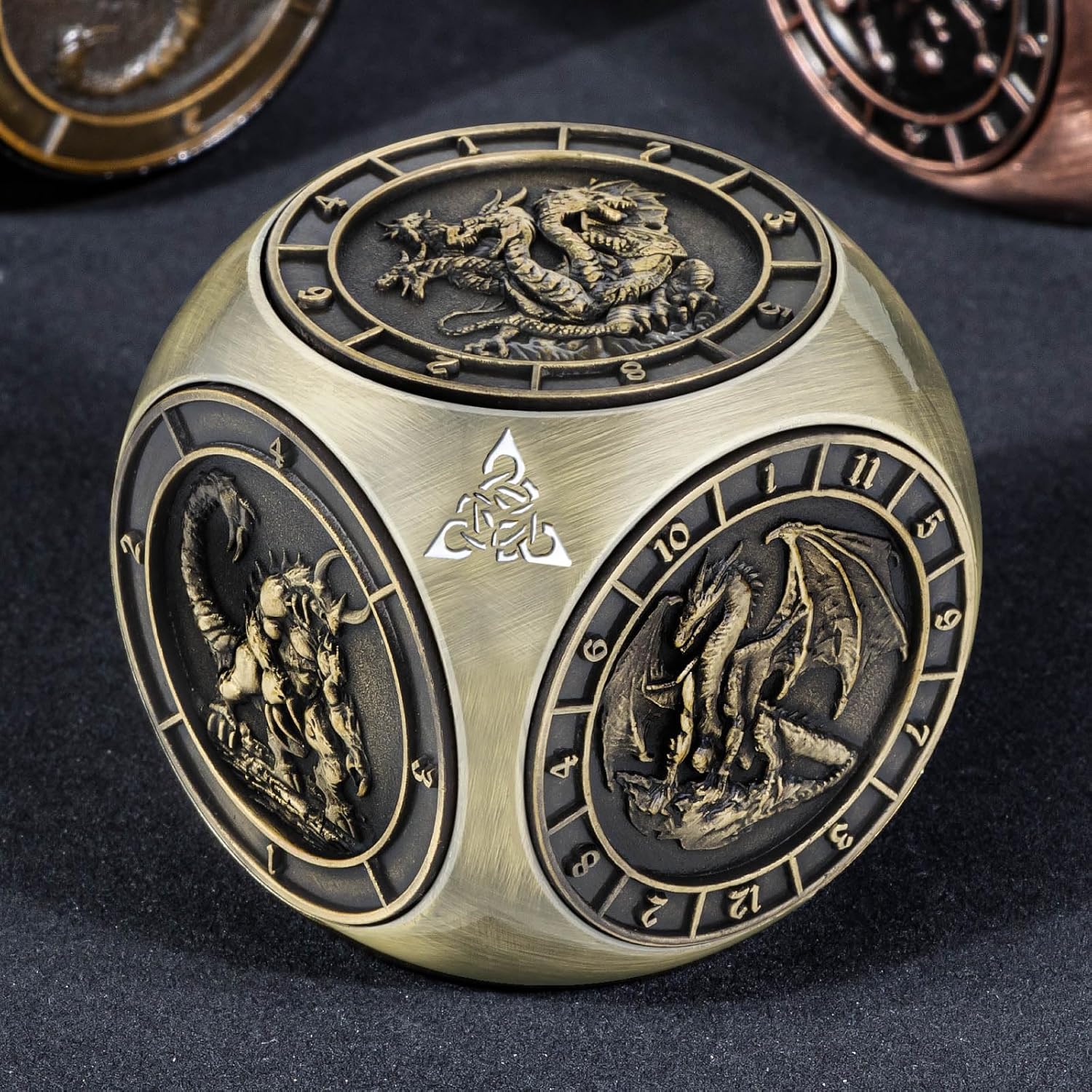 7 in 1 D6 Spinner DND Dice Set D&D, Metal Cube D and D Dice with Gift Box, Dungeons Dragons Role Playing Dice, Bronze