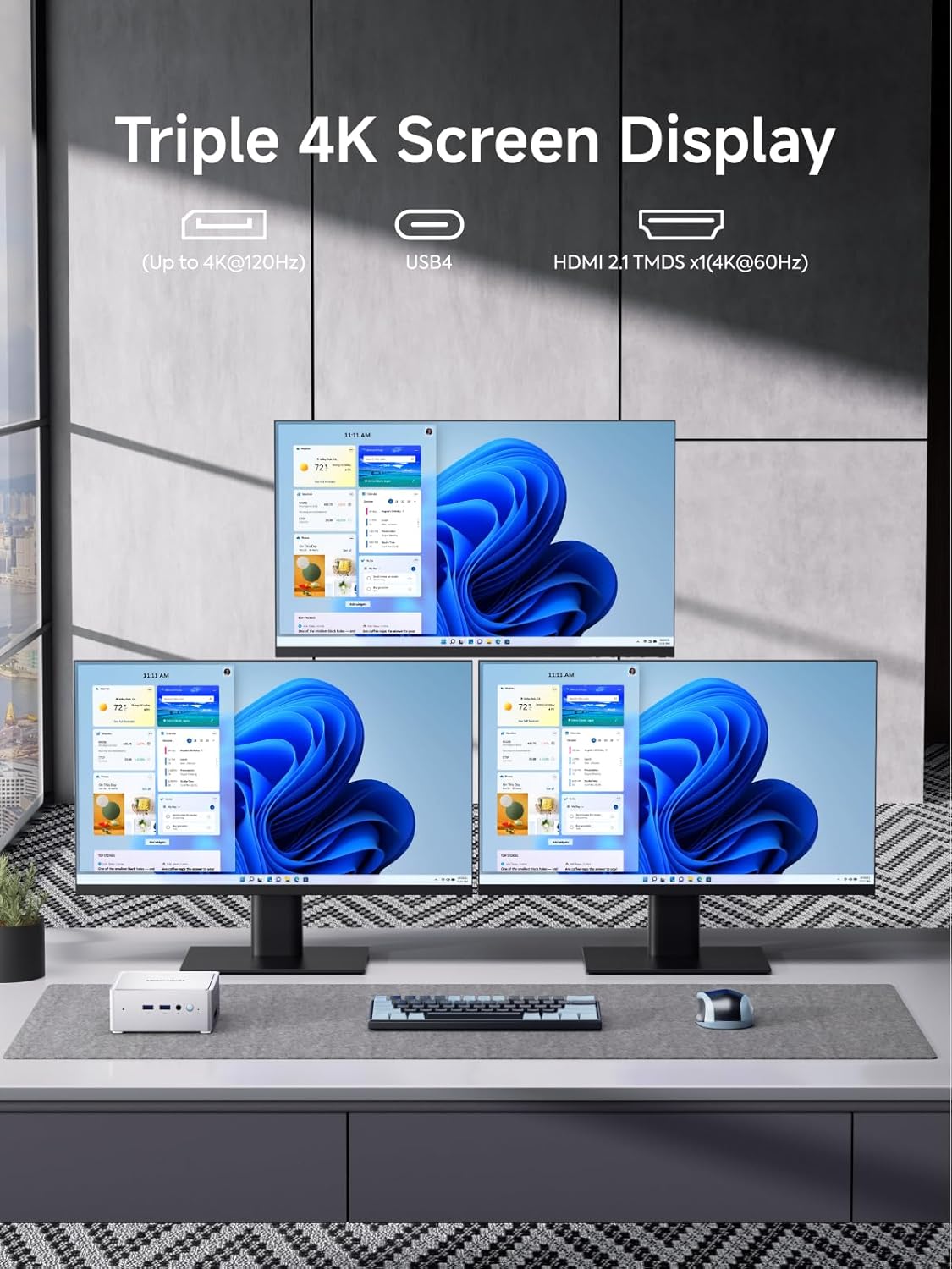 - Triple Screen Display: This mini computer is equipped with HDMI2.1 (8K@60Hz | 4K@120Hz), USB4 (4K@60Hz) and DisplayPort1.4 (4K@120Hz | 4K@240Hz) display output. To meet the demands of everyday multitasking, you can connect three separate displays simultaneously. Expansion of multiple workspaces for productivity enhancement.Features M.2 2230 E-Key port (PCIe Only) for wireless expansion, along with a RJ45 2.5G Lan Port for ultra-fast wired networking, ensuring seamless online experiences.