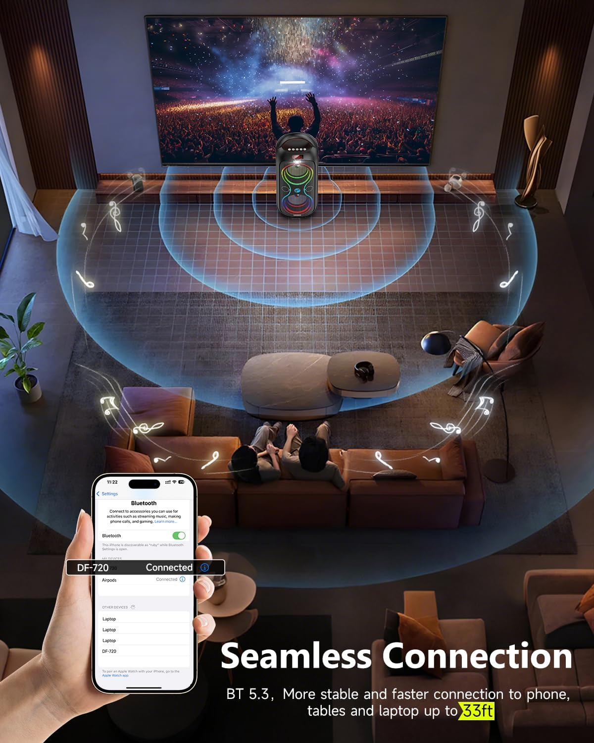 - 【Dynamic Beat-Driven Light Show】Elevate your vibe with 5 vibrant RGB lighting modes (including strobe & rhythm sync). Bring the bluetooth speaker to watch the lights bounce to the beat of the music, creating an electrifying atmosphere for every party.