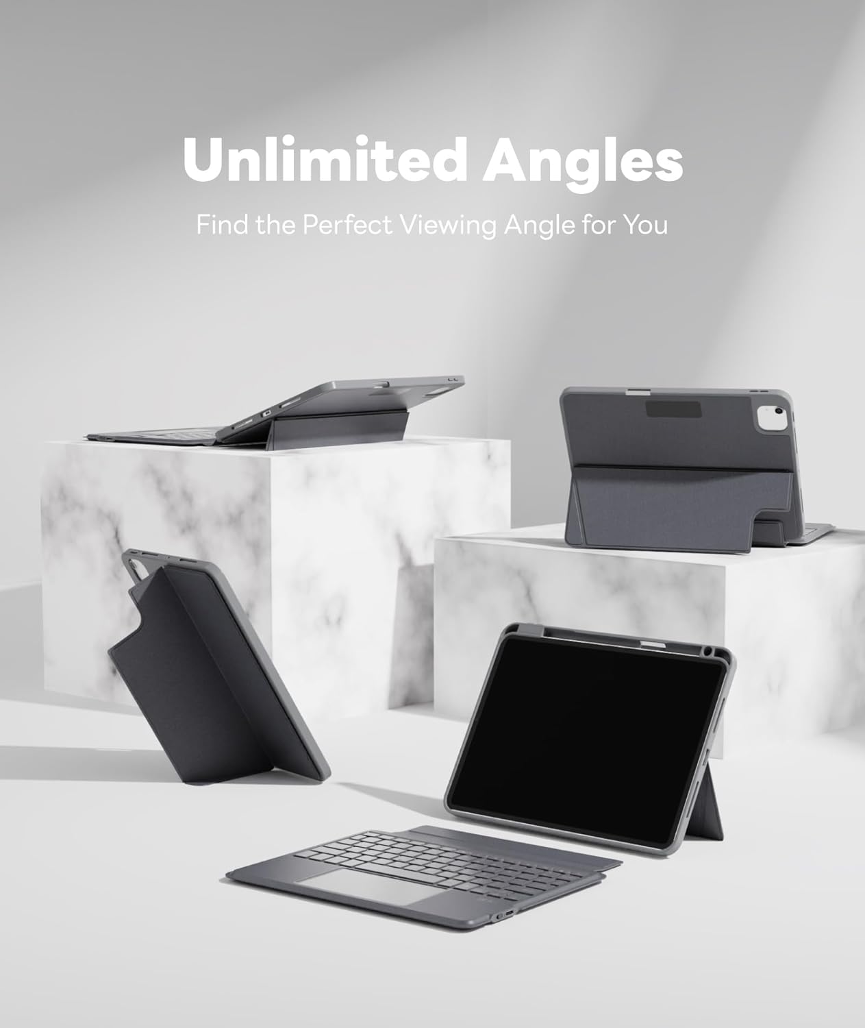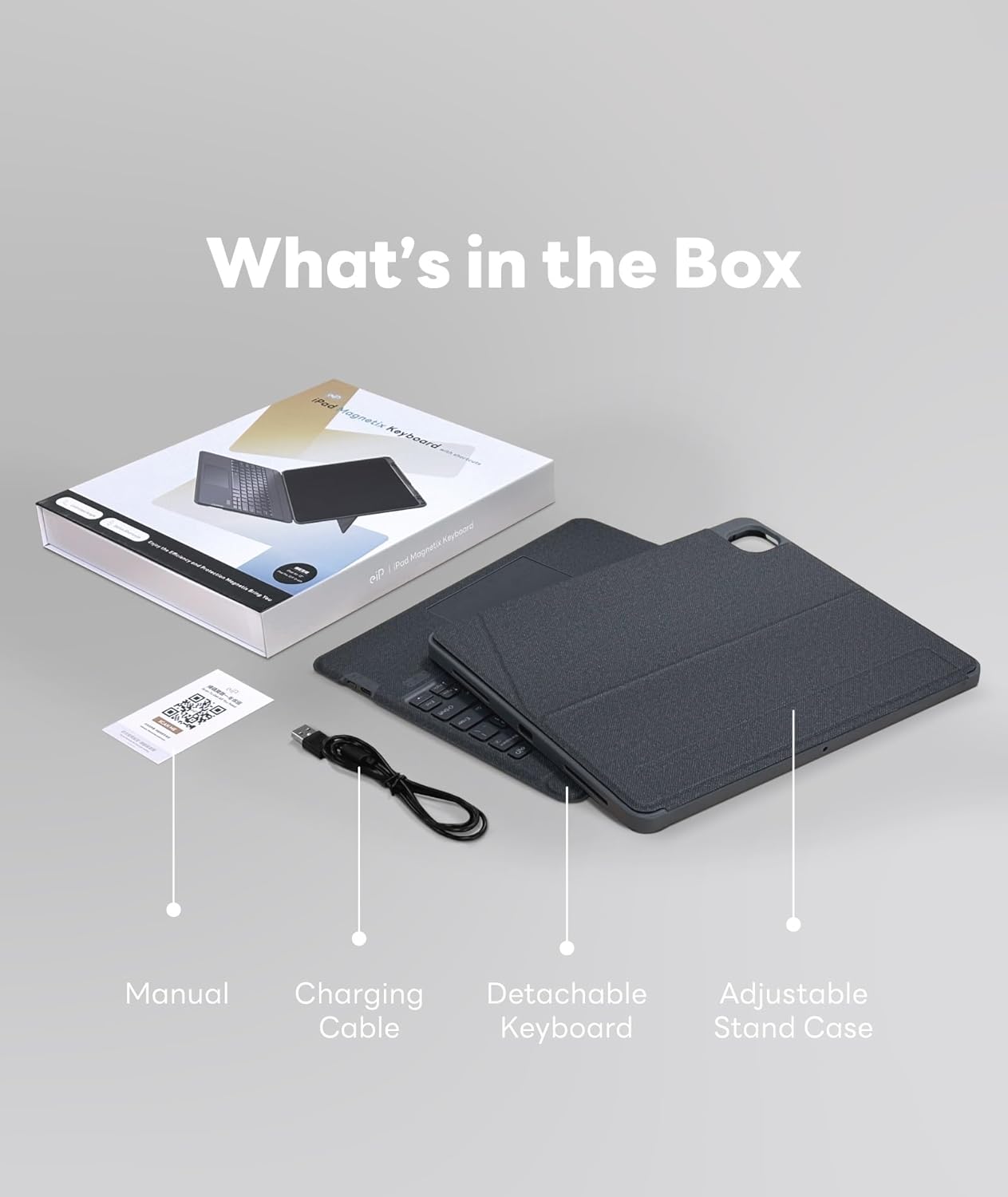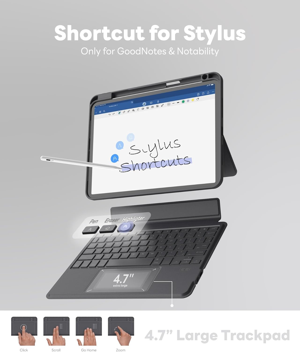 - 🧲 Magnetic Detachable Keyboard - Securely attaches to the protective case using a strong magnetic strip. You can detach and store the keyboard separately, leaving the case and back stand. This setup allows you to place the iPad on your lap for reading, watching videos, or drawing. Switching between iPad and Laptop modes becomes effortless