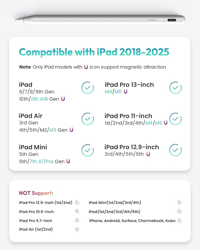 - 【Make Sure Your iPad Model is Compatible】: Metapen Pencil A8 V4 is ONLY compatible with the iPad models 2018-2025: iPad Mini 5/6/7 (A17 Pro) Gen, iPad 11/10/9/8/7/6 Gen, iPad Pro 13-inch M4/M5, iPad Pro 11-inch 1/2/3/4/M4/M5, iPad Air 3/4/5/M2/M3, iPad Pro 12.9-inch 3/4/5/6 Gen. NOTE: The Pencil A8 V4 is NOT compatible with iPads before 2018, iPhone, Android or Microsoft devices. Please check your iPad model before ordering