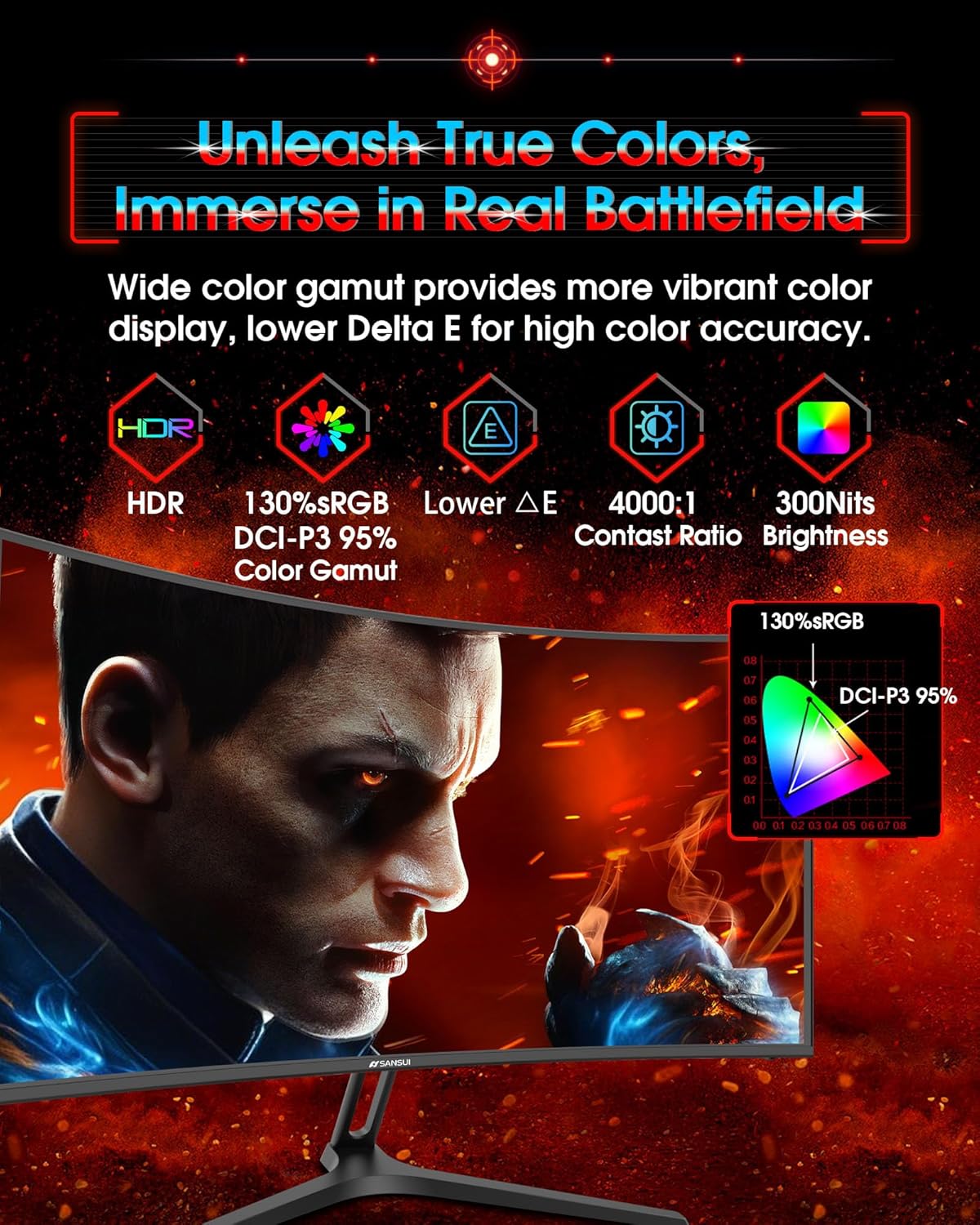 - Cinematic Color Accuracy: 130% sRGB & DCI-P3 95% color gamut, 4000:1 contrast ratio, 300nits brightness, HDR, Anti-flicker; Anti-Glare.