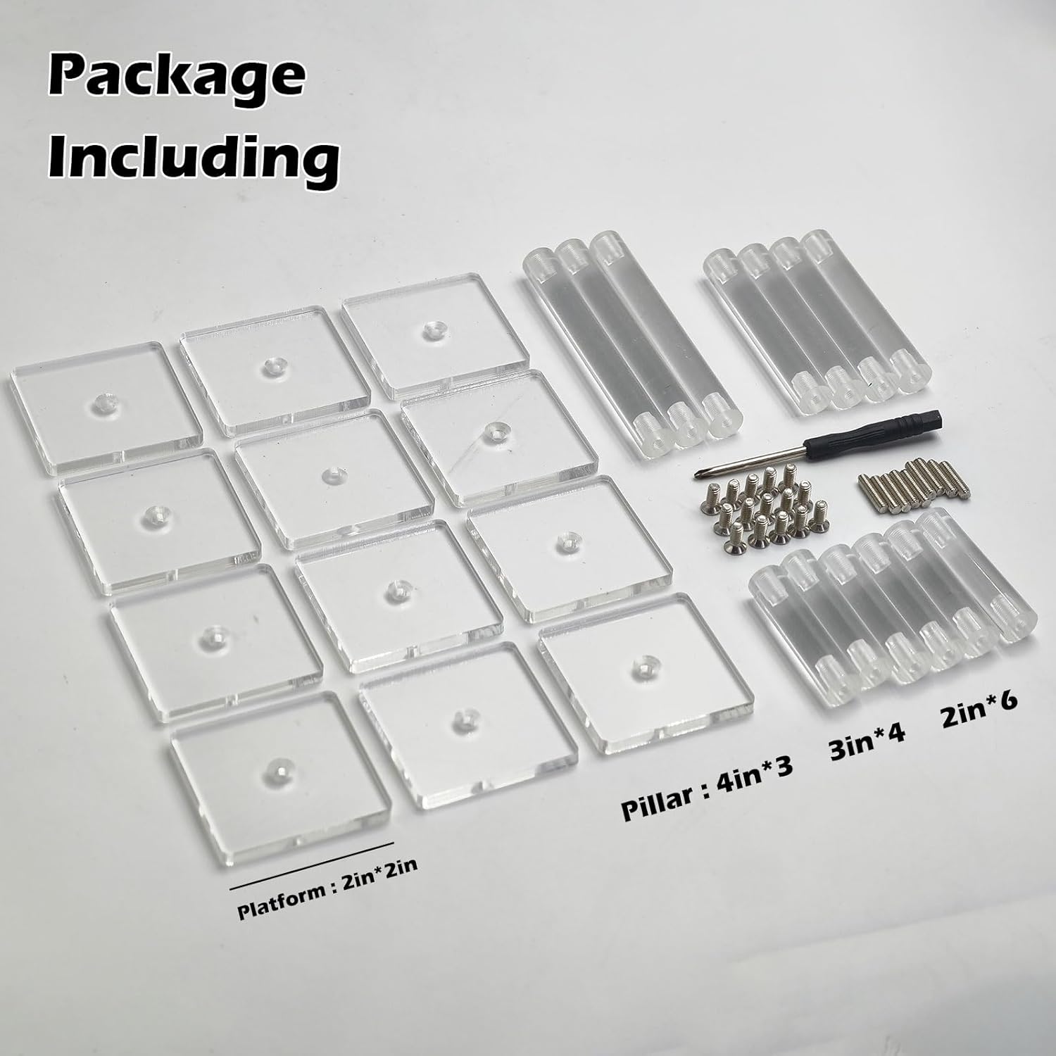 - Adjustable Height: Each combat risers set contains four 2" stands, three 3" stands, two 4" stands and six 2" square plates, they can be adjusted 2 - 21" to different heights, allow you to create various heights, and stage platforms allow players to place multiple characters in simulated flight or battle