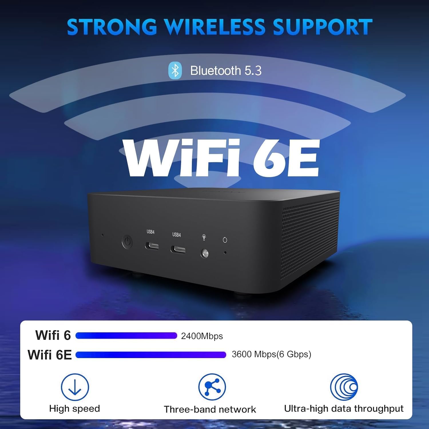 - 【Intel Wireless Technology】Mini gaming pc amd ryzen 9 Intel's original network card, Intel Wi-Fi 6E AX210 on M.2 slot, supporting 802.11ax and Bluetooth 5.3 w/internal antennas. Provides higher concurrency, lower latency and greater bandwidth, bluetooth5.3's longer transmission distance, better transmission stability, and lower power consumption.