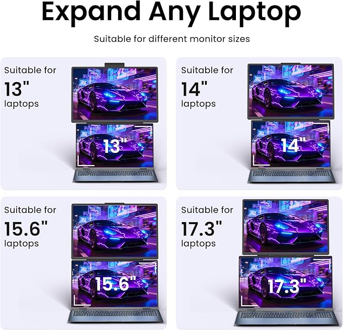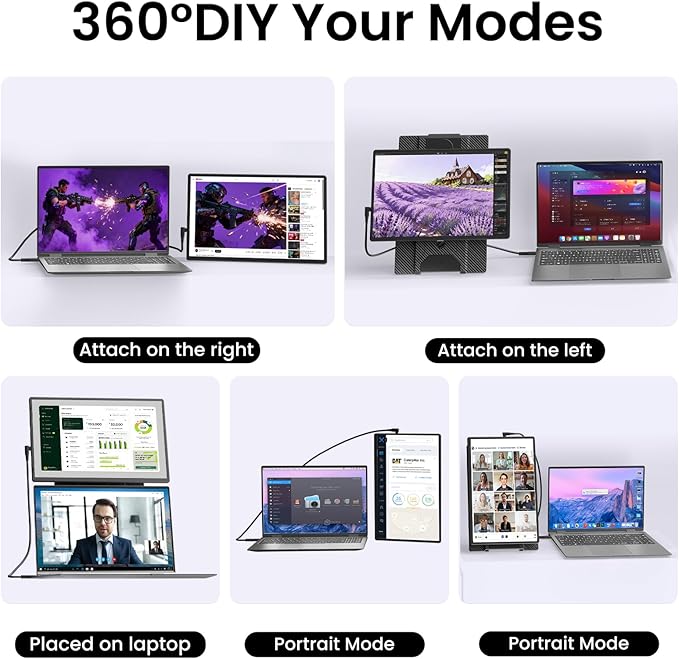 - Fully Adjustable Magnetic Stand: Easily detach, rotate, or slide the magnetic stand to set up your screen in seconds. Switch between landscape and portrait mode, adjust the height to fit 13–17.5 inch laptops, or use the VESA 75x75mm mount for desk or wall placement.