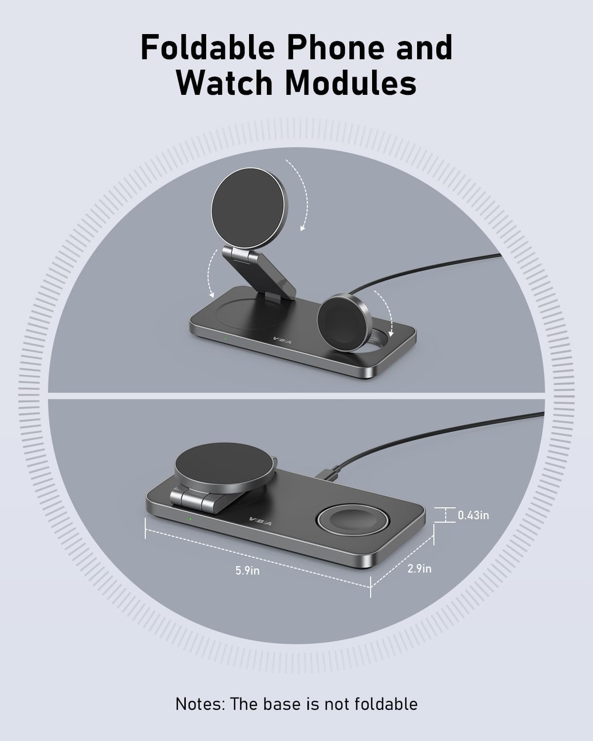 - 【Slim,Foldable & Portable Travel Charger】Engineered for life on the go, our ultra-compact 3-in-1 wireless charger folds down to the size of an iPhone 16, travel-friendly & space-saving,Perfectly for travel, office and bedside use. Phone charger part folds 0-180° for optimal viewing&charging, while the Watch charger rotates 0-89° for Nightstand Mode. Sturdy weighted base makes it stays firmly in place even with your heaviest phone. Premium glossy electroplating,Sleek, scratch-resistant finish elevates any space.