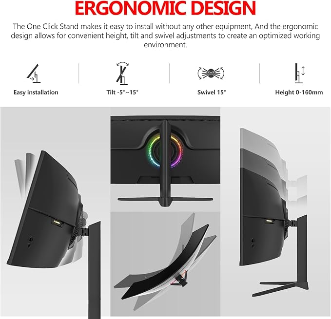 - Ergonomic Adjustable Stand & Eye Comfort - Customize your setup with a height-adjustable stand (3.42–7.82 inches), tilt, and swivel options. DC dimming technology eliminates screen flicker, while low blue light mode filters harmful wavelengths, reducing eye strain during extended use.