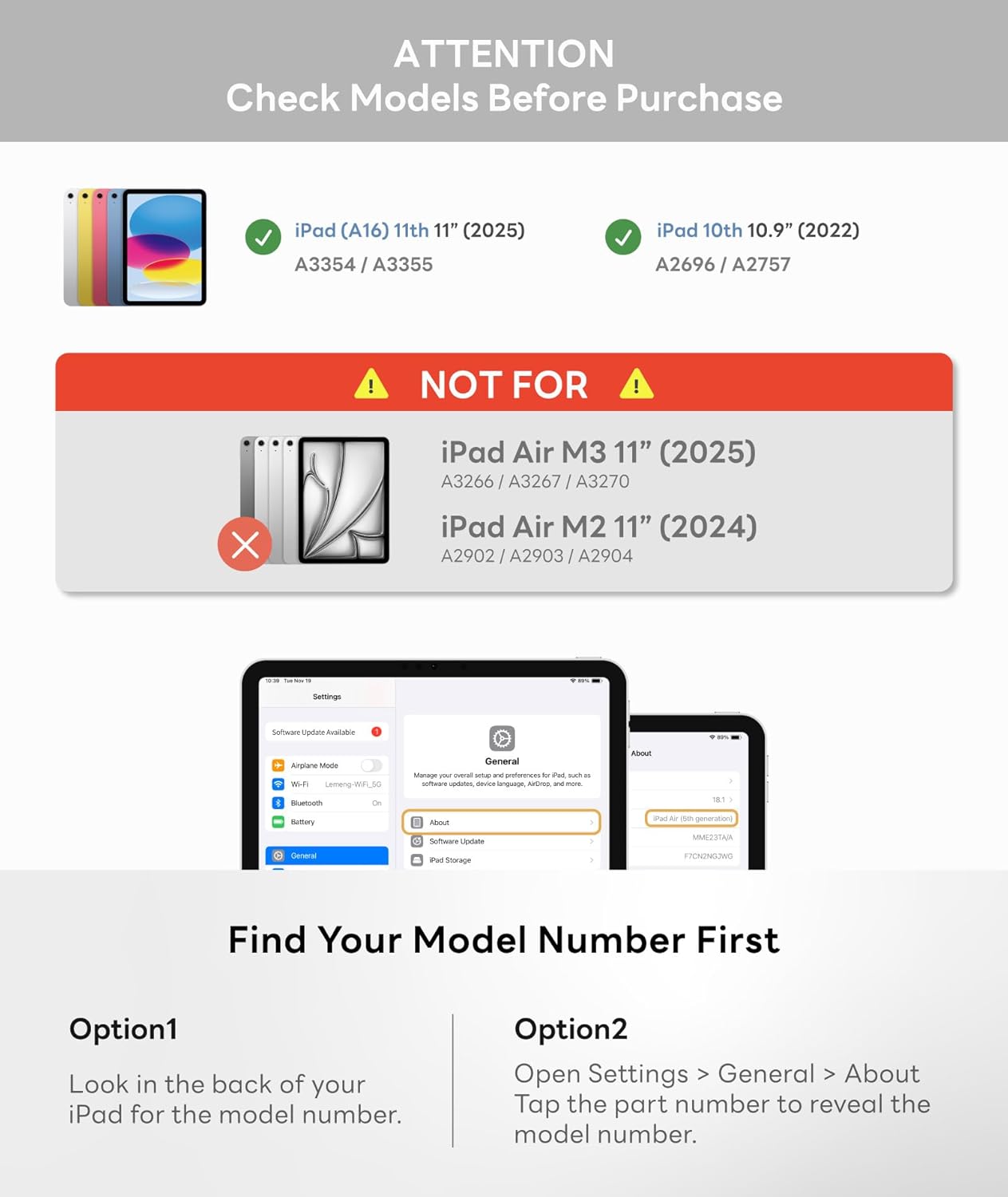 - ăCompatibilityă- This keyboard case is designed for iPad (A16) 11â 11th 2025 (A3354, A3355), iPad 10th 2022 (A2696, A2757). Find Your Model: Setting â General â About â Model Name and number. Please check your iPad model before purchase.