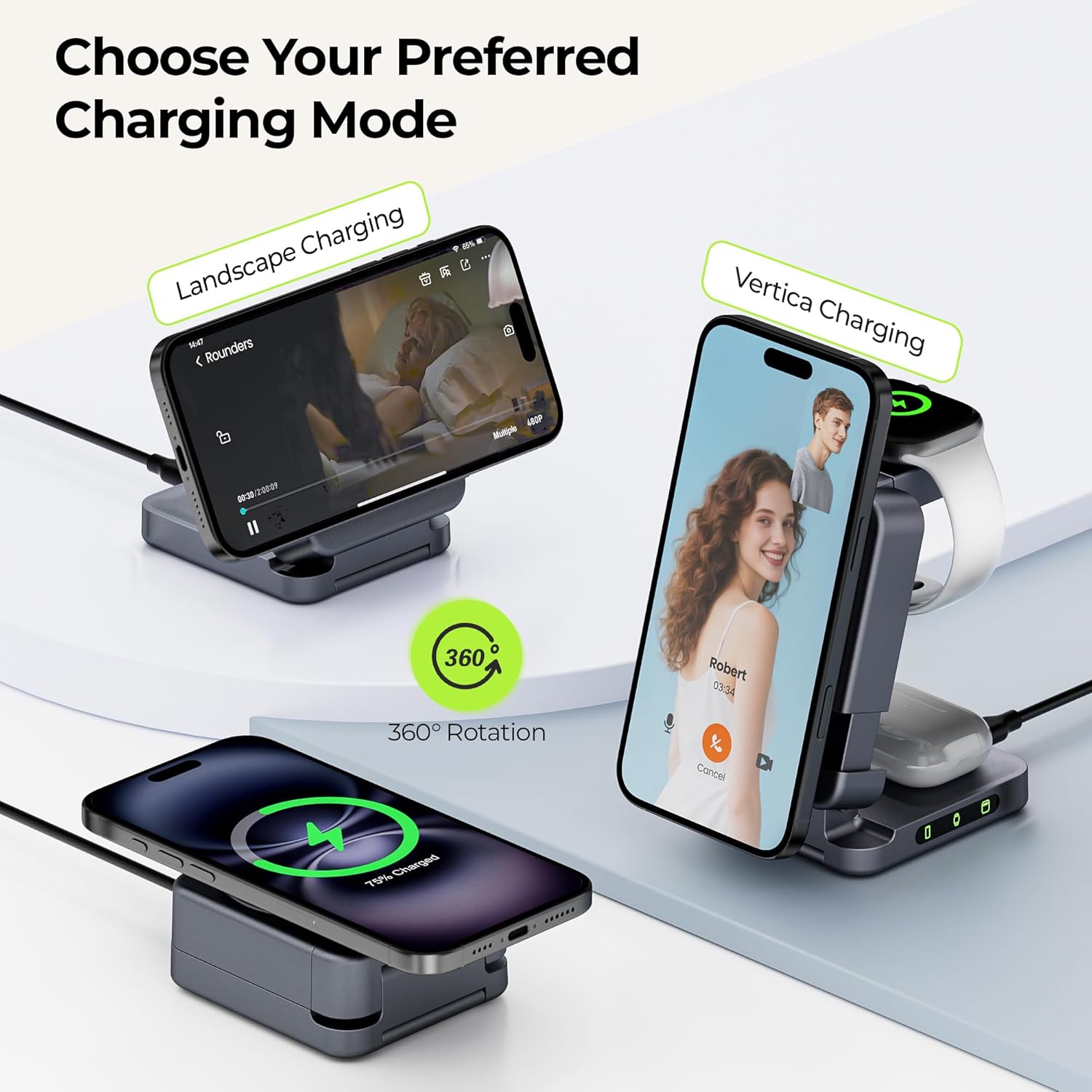 【2025 Upgraded】 Wireless Charger 3 in 1, Foldable Wireless Charging Station, Travel Magnetic Charger Stand, Nightstand 15W Charging Station for iPhone 16 Samsung S25 Samsung Watch TWS Earphone