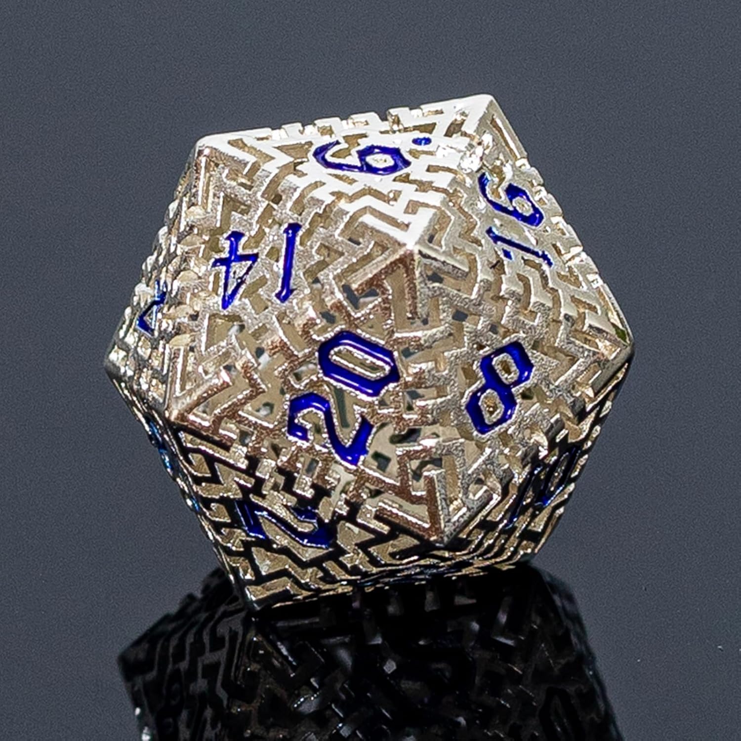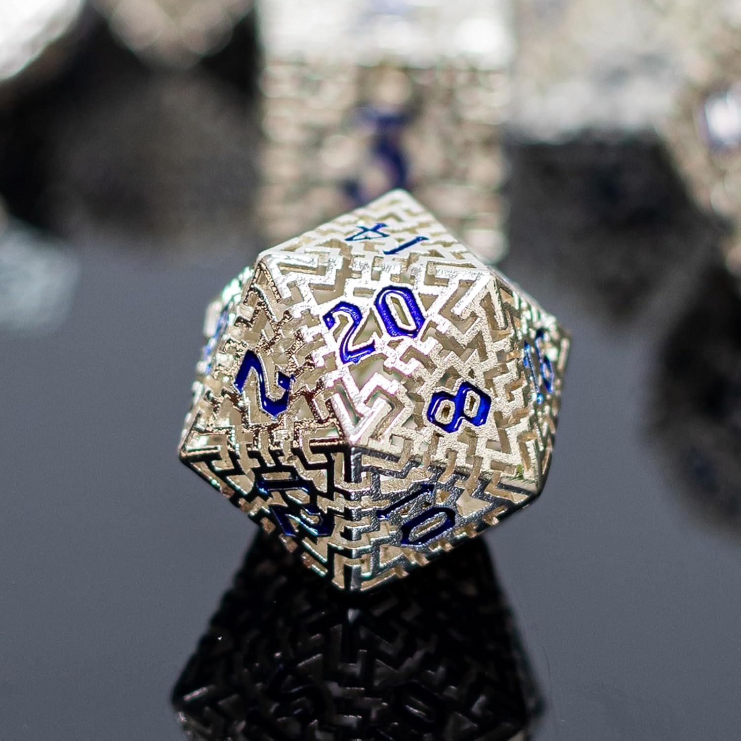 Silver Metal Hollow DND Dice Set (Cleric) Metallic Luster Maze Design with Storage Box - Balanced Weight 7 Piece Zinc Alloy, Designed for Dungeons and Dragons DM and Player RPG Accessories