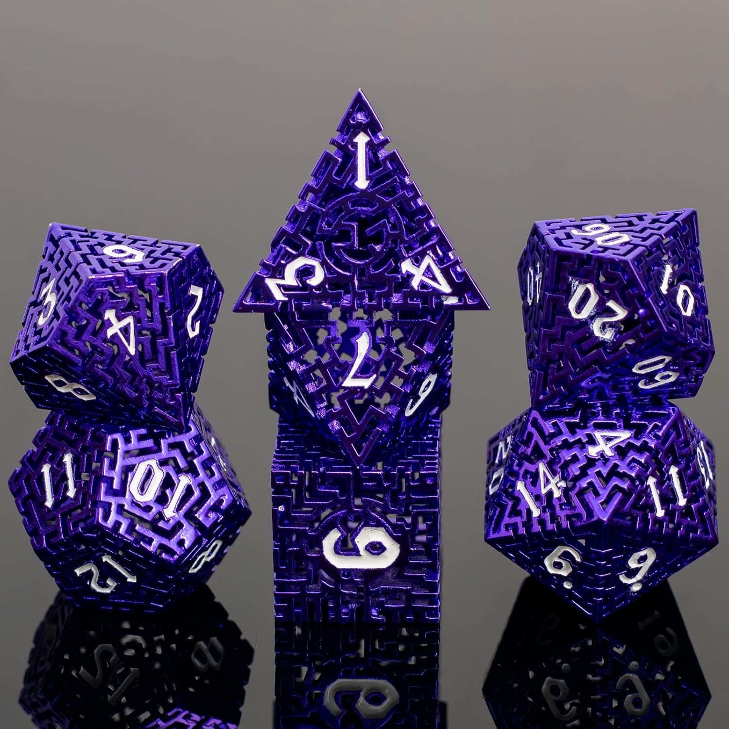 Purple Metal Hollow DND Dice Set (Warlock) Metallic Luster Maze Design with Storage Box - Balanced Weight 7 Piece Zinc Alloy, Designed for Dungeons and Dragons DM Player RPG Accessories