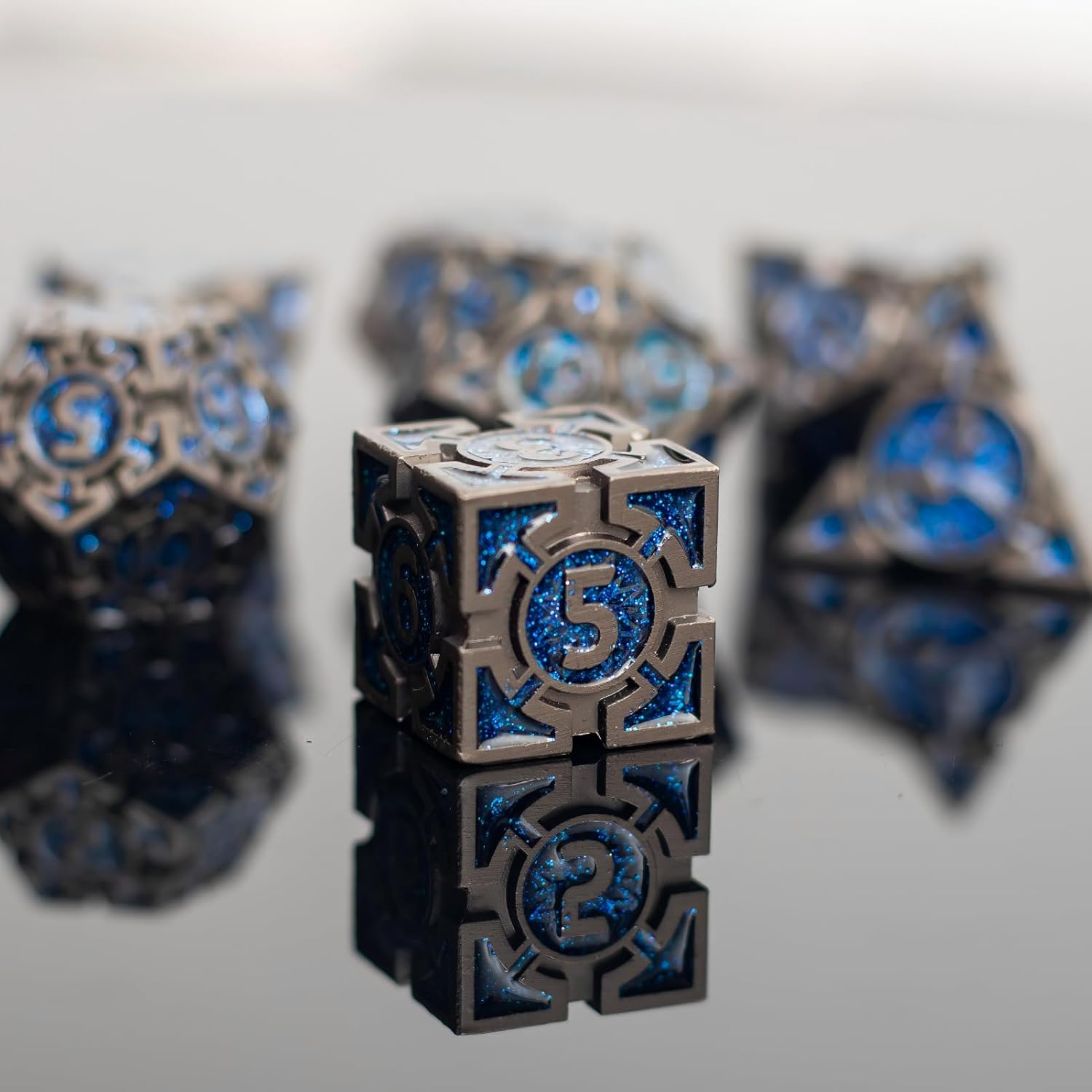 Blue Black Nickel Finish Heavy Metal DND Dice Set (Wizard) with A Metal Box, Sharp Edge Zinc Alloy D&D Accessories, D4-D20, Designed for Dungeons & Dragons Master, RPG Player, Starter
