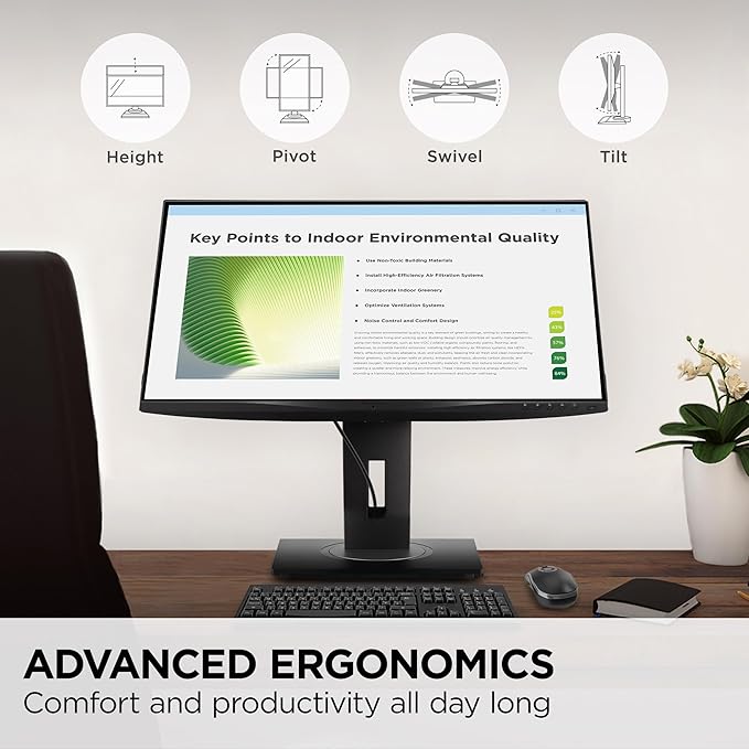 - ERGONOMIC STAND: Advanced ergonomics (tilt, swivel, rotate and height adjustment) for all-day comfort