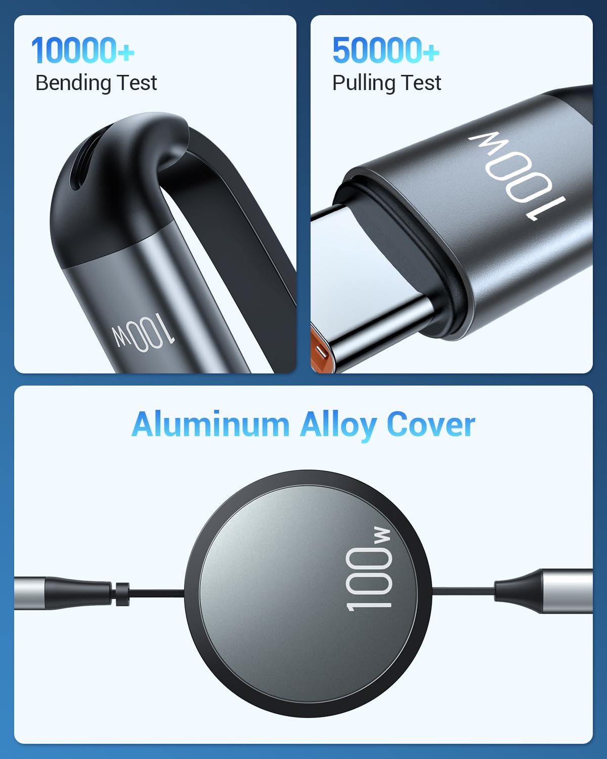 - 100W Hyper-Fast Charging with Intelligent Safety: Our multi phone chargers for all devices features an E-Marker chip and premium pure copper wires for blistering 100W speeds. Charge a MBook Pro 16" to 38%, Galaxy S24 Ultra to 80%, or Phone 15 to 75% in just 30 minutes! Smart technology automatically switches to gentle trickle mode at 80% to prevent overheating/overcharging - your device's battery health is our priority. The ultimate retractable phone charger for car, home, or office use.