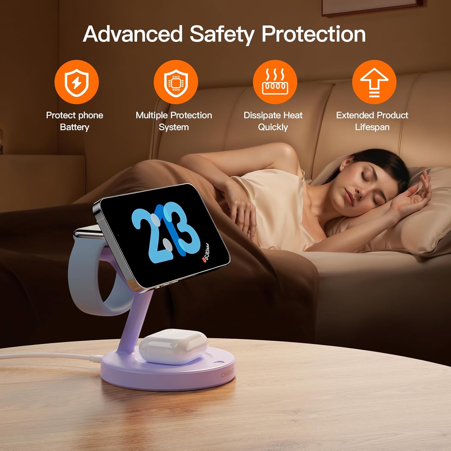 - ăFriendly improvement of lightingă: Many American friends have mentioned a very bad problem, which is that the charging station has glaring lights during sleep at night, which is very unfriendly. LYAOAO's wireless charger eliminates this bad design, simplifies the product, and improves the safety protection of the product, allowing you to have a good dream sleep at night