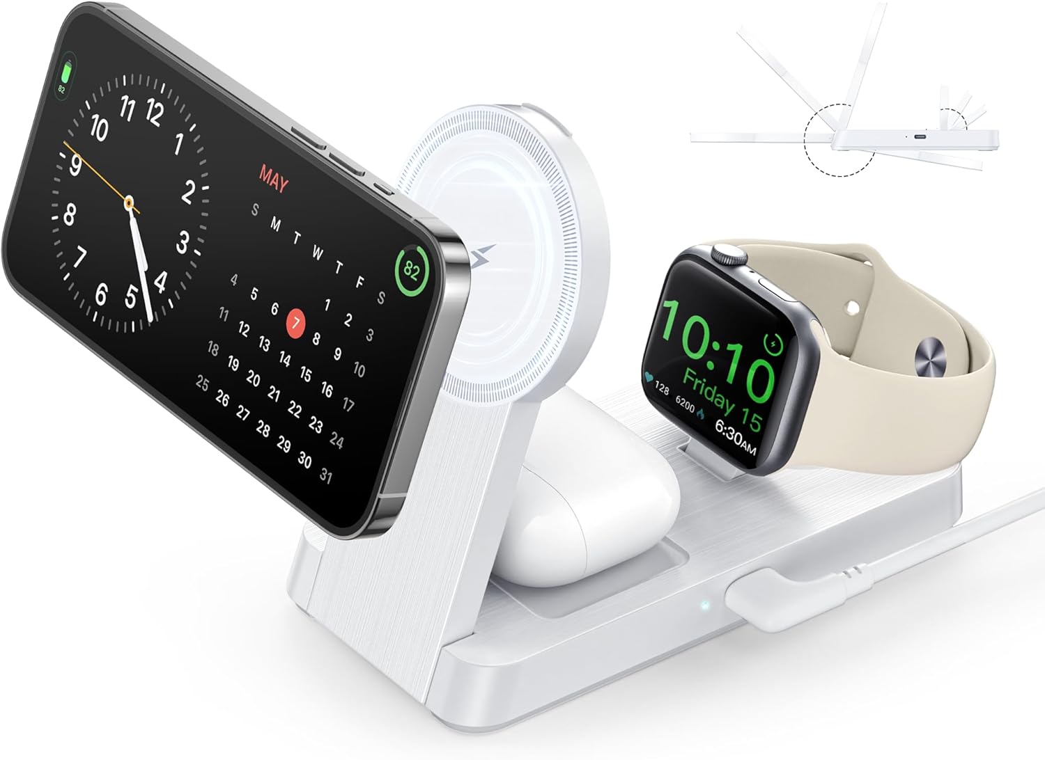 - Perfect for Multi-Scenario Use: 1> Bedside: Nightstand Mode: Soft Charging Indicator Light Ensures Undisturbed Quality Sleep. 2> Office: Vertical Stand for FaceTime/Notification Viewing. 3> Travel: Lightweight (5.28oz). 4> Gift: The 3 in 1 charging station is perfect for Festive Gift(Christmas, Thanksgiving Day and Birthday).