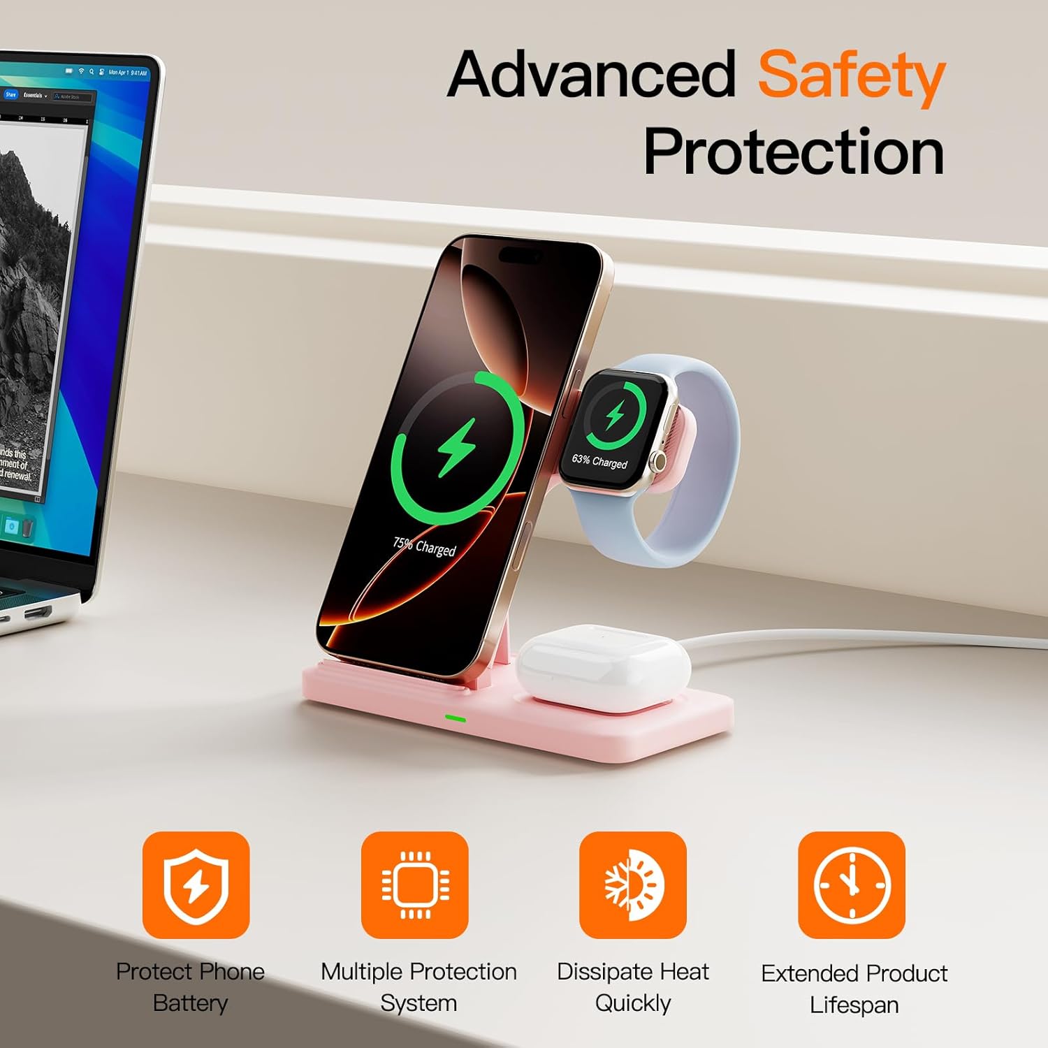 - 【3 in 1 Wireless Charging Station】 : Designed for users of products, wireless charging allows you to charge for watch & Airpods simultaneously with just one cable. With a built-in wide-range induction coil and wireless charger technology, it brings you an easy and convenient charging experience without the hassle of cluttered wires. Note: Please do not wear a case thicker than 5mm(0.2")& Please update the system of the device promptly.