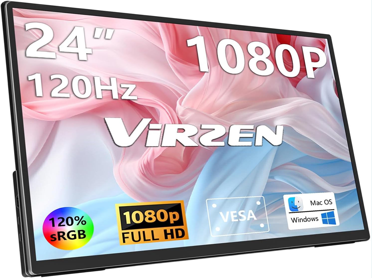 - 【Slim, Borderless & Portable Design】 Compared to bulky traditional monitors, the Virzen 24-inch portable monitor strikes the perfect balance between screen size and portability. Its borderless design and ultra-slim profile allow it to fit easily into a backpack, making it highly portable! Whether you're at the office, a Coffee Shop, or traveling, this portable laptop monitor can be instantly pulled out and used as a second or extender screen, boosting productivity while adding entertainment value—the perfect travel companion for laptops and smartphones.
